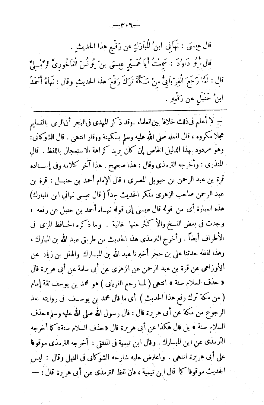 : هَذِهِ الْعِبَارَة أَيْ مِنْ قَوْله قَالَ عِيسَى إِلَى قَوْله نَهَاهُ أَحْمَد بْن حَنْبَل عَنْ رَفْعه ، وُجِدَت فِي بَعْض النُّسَخ وَالْأَكْثَر عَنْهَا خَالِيَة . وَمَا ذَكَرَهُ الْحَافِظ الْمِزِّيُّ فِي الْأَطْرَاف أَيْضًا . وَأَخْرَجَ التِّرْمِذِيّ هَذَا الْحَدِيث مِنْ طَرِيق عَبْد اللَّه بْن الْمُبَارَك ، وَهَذَا لَفْظه حَدَّثَنَا عَلِيّ بْن حُجْرٍ أَخْبَرَنَا عَبْد اللَّه بْن الْمُبَارَك وَالْهِقْل بْن زِيَاد عَنْ الْأَوْزَاعِيِّ عَنْ قُرَّة بْن عَبْد الرَّحْمَن عَنْ الزُّهْرِيّ عَنْ أَبِي سَلَمَة عَنْ أَبِي هُرَيْرَة قَالَ " حَذْفُ السَّلَام سُنَّةٌ " اِنْتَهَى