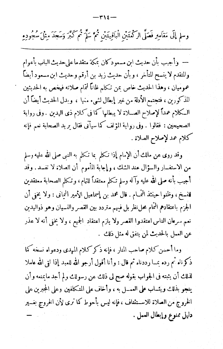 وَقَدْ رُوِيَ عَنْ مَالِك أَنَّ الْإِمَام إِذَا تَكَلَّمَ بِمَا تَكَلَّمَ بِهِ النَّبِيّ صَلَّى اللَّه عَلَيْهِ وَسَلَّمَ مِنْ الِاسْتِفْسَار وَالسُّؤَال عِنْد الشَّكّ ، وَإِجَابَة الْمَأْمُوم أَنَّ الصَّلَاة لَا تَفْسُدُ . وَقَدْ أُجِيبَ بِأَنَّهُ صَلَّى اللَّه عَلَيْهِ وَسَلَّمَ تَكَلَّمَ مُعْتَقِدًا لِلتَّمَامِ ، وَتَكَلَّمَ الصَّحَابَة مُعْتَقِدِينَ لِلنَّسْخِ ، وَظَنُّوا حِينَئِذٍ التَّمَامَ . قَالَ مُحَمَّد بْن إِسْمَاعِيل الْأَمِير الْيَمَانِي : وَلَا يَخْفَى أَنَّ الْجَزْم بِاعْتِقَادِهِمْ التَّمَام مَحَلّ نَظَر بَلْ فِيهِمْ مُتَرَدِّدٌ بَيْن الْقَصْر وَالنِّسْيَان وَهُوَ ذُو الْيَدَيْنِ نَعَمْ سَرَعَان النَّاس اِعْتَقَدُوا الْقَصْر وَلَا يَلْزَم اِعْتِقَاد الْجَمِيع ، وَلَا يَخْفَى أَنَّهُ لَا عُذْر عَنْ الْعَمَل بِالْحَدِيثِ لِمَنْ يَتَّفِق لَهُ مِثْلُ ذَلِكَ .