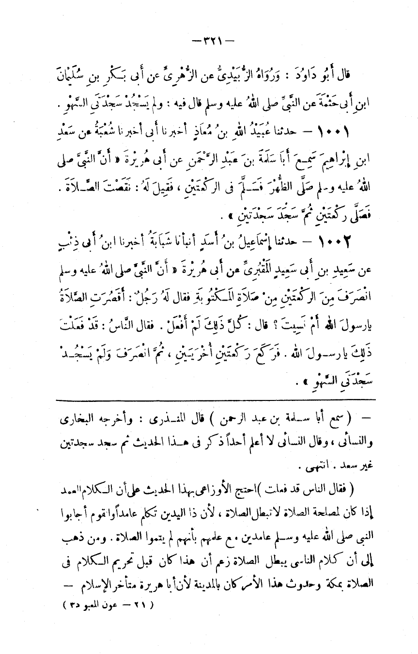 : اِحْتَجَّ الْأَوْزَاعِيُّ بِهَذَا الْحَدِيث عَلَى أَنَّ الْكَلَام الْعَمْد إِذَا كَانَ لِمَصْلَحَةِ الصَّلَاة لَا تَبْطُل الصَّلَاة ، لِأَنَّ ذَا الْيَدَيْنِ تَكَلَّمَ عَامِدًا وَالْقَوْم أَجَابُوا النَّبِيّ صَلَّى اللَّه عَلَيْهِ وَسَلَّمَ عَامِدِينَ مَعَ عِلْمهمْ بِأَنَّهُمْ لَمْ يُتِمُّوا الصَّلَاة . وَمَنْ ذَهَبَ إِلَى أَنَّ كَلَام النَّاس يُبْطِل الصَّلَاة زَعَمَ أَنَّ هَذَا كَانَ قَبْل تَحْرِيم الْكَلَام فِي الصَّلَاة بِمَكَّة وَحُدُوث هَذَا الْأَمْر كَانَ بِالْمَدِينَةِ لِأَنَّ أَبَا هُرَيْرَة مُتَأَخِّر الْإِسْلَام@