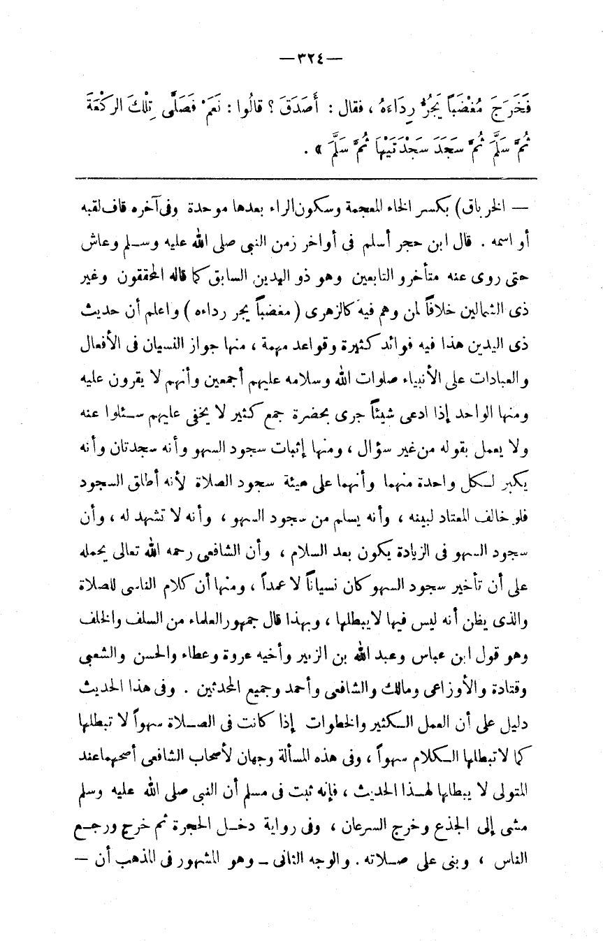 : وَاعْلَمْ أَنَّ حَدِيث ذِي الْيَدَيْنِ هَذَا فِيهِ فَوَائِد كَثِيرَة وَقَوَاعِد مُهِمَّة ، مِنْهَا جَوَاز النِّسْيَان فِي الْأَفْعَال وَالْعِبَادَات عَلَى الْأَنْبِيَاء صَلَوَات اللَّه وَسَلَامه عَلَيْهِمْ أَجْمَعِينَ وَأَنَّهُمْ لَا يُقَرُّونَ عَلَيْهِ وَمِنْهَا الْوَاحِد إِذَا ادَّعَى شَيْئًا جَرَى بِحَضْرَةِ جَمْع كَثِير لَا يَخْفَى عَلَيْهِمْ سُئِلُوا عَنْهُ وَلَا يُعْمَل بِقَوْلِهِ مَنْ غَيْر سُؤَال ، وَمِنْهَا إِثْبَات سُجُود السَّهْو وَأَنَّهُ سَجْدَتَانِ وَأَنَّهُ يُكَبِّر لِكُلِّ وَاحِدَة مِنْهُمَا وَأَنَّهُمَا عَلَى هَيْئَة سُجُود الصَّلَاة لِأَنَّهُ أَطْلَقَ السُّجُود فَلَوْ خَالَفَ الْمُعْتَاد لَبَيَّنَهُ ، وَأَنَّهُ يُسَلَّم مِنْ سُجُود السَّهْو ، وَأَنَّهُ لَا تَشَهُّد لَهُ ، وَأَنَّ سُجُود السَّهْو فِي الزِّيَادَة يَكُون بَعْد السَّلَام ، وَأَنَّ الشَّافِعِيّ رَحِمَهُ اللَّه تَعَالَى يَحْمِلهُ عَلَى أَنَّ تَأْخِير سُجُود السَّهْو كَانَ نِسْيَانًا لَا عَمْدًا ، وَمِنْهَا أَنَّ كَلَام النَّاس لِلصَّلَاةِ وَاَلَّذِي يُظَنّ أَنَّهُ لَيْسَ فِيهَا لَا يُبْطِلُهَا ، وَبِهَذَا قَالَ جُمْهُور الْعُلَمَاء مِنْ السَّلَف وَالْخَلَف وَهُوَ قَوْل اِبْن عَبَّاس وَعَبْد اللَّه بْن الزُّبَيْر وَأَخِيهِ عُرْوَة وَعَطَاء وَالْحَسَن وَالشَّعْبِيّ وَقَتَادَة وَالْأَوْزَاعِيّ وَمَالِك وَالشَّافِعِيّ وَأَحْمَد وَجَمِيع الْمُحَدِّثِينَ . وَفِي هَذَا الْحَدِيث دَلِيل عَلَى أَنَّ الْعَمَل الْكَثِير وَالْخُطُوَات إِذَا كَانَتْ فِي الصَّلَاة سَهْوًا لَا تُبْطِلهَا كَمَا لَا يُبْطِلهَا الْكَلَام سَهْوًا ، وَفِي هَذِهِ الْمَسْأَلَة وَجْهَانِ لِأَصْحَابِ الشَّافِعِيّ أَصَحّهمَا عِنْد الْمُتَوَلِّي لَا يُبْطِلهَا لِهَذَا الْحَدِيث ، فَإِنَّهُ ثَبَتَ فِي مُسْلِم أَنَّ النَّبِيّ صَلَّى اللَّه عَلَيْهِ وَسَلَّمَ مَشَى إِلَى الْجِذْع وَخَرَجَ السَّرَعَان ، وَفِي رِوَايَة دَخَلَ الْحُجْرَة ثُمَّ خَرَجَ وَرَجَعَ النَّاس ، وَبَنَى عَلَى صَلَاته . وَالْوَجْه الثَّانِي وَهُوَ الْمَشْهُور فِي الْمَذْهَب أَنَّ @
