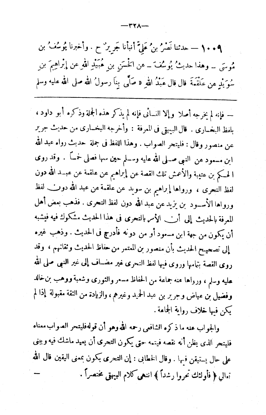 فَإِنَّهُ لَمْ يُخْرِجهُ أَصْلًا وَإِلَّا النَّسَائِيّ فَإِنَّهُ لَمْ يَذْكُر هَذِهِ الْجُمْلَة وَذَكَرَهُ أَبُو دَاوُدَ ، بِلَفْظِ الْبُخَارِيّ . قَالَ الْبَيْهَقِيُّ فِي الْمَعْرِفَة : وَأَخْرَجَهُ الْبُخَارِيّ مِنْ حَدِيث جَرِير عَنْ مَنْصُور وَقَالَ : فَلْيَتَحَرَّ الصَّوَاب . وَهَذَا اللَّفْظ فِي جُمْلَة حَدِيث رَوَاهُ عَبْد اللَّه بْن مَسْعُود عَنْ النَّبِيّ صَلَّى اللَّه عَلَيْهِ وَسَلَّمَ حِينَ سَهَا فَصَلَّى خَمْسًا . وَقَدْ رَوَى الْحَكَم بْن عُتَيْبَة وَالْأَعْمَش تِلْكَ الْقِصَّة عَنْ إِبْرَاهِيم عَنْ عَلْقَمَة عَنْ عَبْد اللَّه دُون لَفْظ التَّحَرِّي ، وَرَوَاهَا إِبْرَاهِيم بْن سُوَيْدٍ عَنْ عَلْقَمَة عَنْ عَبْد اللَّه دُون لَفْظ التَّحَرِّي وَرَوَاهَا الْأَسْوَد بْن يَزِيد عَنْ عَبْد اللَّه دُون لَفْظ التَّحَرِّي . فَذَهَبَ بَعْض أَهْل الْمَعْرِفَة بِالْحَدِيثِ إِلَى أَنَّ الْأَمْر بِالتَّحَرِّي فِي هَذَا الْحَدِيث مَشْكُوك فِيهِ فَيُشْبِه أَنْ يَكُون مِنْ جِهَة اِبْن مَسْعُود أَوْ مَنْ دُونه فَأُدْرِجَ فِي الْحَدِيث . وَذَهَبَ غَيْره إِلَى تَصْحِيح الْحَدِيث بِأَنَّ مَنْصُور بْن الْمُعْتَمِر مِنْ حُفَّاظ الْحَدِيث وَثِقَاتهمْ ، وَقَدْ رَوَى الْقِصَّة بِتَمَامِهَا وَرَوَى فِيهَا لَفْظ التَّحَرِّي غَيْر مُضَاف إِلَى غَيْر النَّبِيّ صَلَّى اللَّه عَلَيْهِ وَسَلَّمَ ، وَرَوَاهَا عَنْهُ جَمَاعَة مِنْ الْحُفَّاظ مِسْعَر وَالثَّوْرِيُّ وَشُعْبَة وَوَهْب بْن خَالِد وَفُضَيْل بْن عِيَاض وَجَرِير بْن عَبْد الْحَمِيد وَغَيْرهمْ ، وَالزِّيَادَة مِنْ الثِّقَة مَقْبُولَة إِذَا لَمْ يَكُنْ فِيهَا خِلَاف رِوَايَة الْجَمَاعَة .