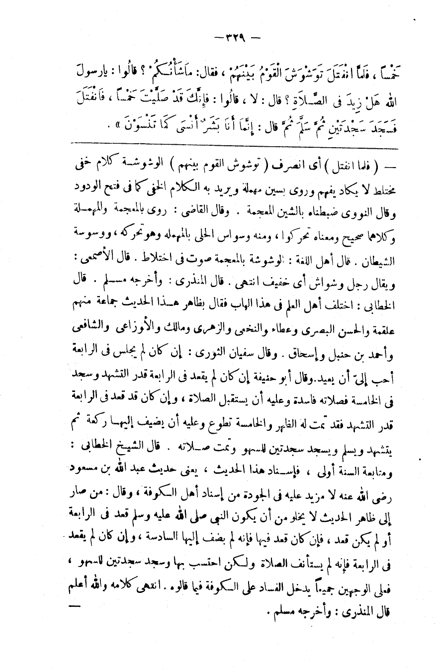 قَالَ الْمُنْذِرِيُّ : وَأَخْرَجَهُ مُسْلِم . قَالَ الْخَطَّابِيُّ : اِخْتَلَفَ أَهْل الْعِلْم فِي هَذَا الْبَاب فَقَالَ بِظَاهِرِ هَذَا الْحَدِيث جَمَاعَة مِنْهُمْ عَلْقَمَة وَالْحَسَن الْبَصْرِيّ وَعَطَاء وَالنَّخَعِيُّ وَالزُّهْرِيّ وَمَالِك وَالْأَوْزَاعِيُّ وَالشَّافِعِيُّ وَأَحْمَد بْن حَنْبَل وَإِسْحَاق . قَالَ سُفْيَان الثَّوْرِيُّ : إِنْ كَانَ لَمْ يَجْلِس فِي الرَّابِعَة أَحَبّ إِلَيَّ أَنْ يُعِيدَ . وَقَالَ أَبُو حَنِيفَة إِنْ كَانَ لَمْ يَقْعُد فِي الرَّابِعَة قَدْر التَّشَهُّد وَسَجَدَ فِي الْخَامِسَة فَصَلَاته فَاسِدَةٌ وَعَلَيْهِ أَنْ يُضِيف إِلَيْهَا رَكْعَة ثُمَّ يَتَشَهَّد وَيُسَلِّم وَيَسْجُد سَجْدَتَيْنِ لِلسَّهْوِ وَتَمَّتْ صَلَاتُهُ . قَالَ الشَّيْخ الْخَطَّابِيُّ : وَمُتَابَعَة السُّنَّة أَوْلَى ، فَإِسْنَاد هَذَا الْحَدِيث ، يَعْنِي حَدِيث عَبْد اللَّه بْن مَسْعُود رَضِيَ اللَّه عَنْهُ لَا مَزِيد عَلَيْهِ فِي الْجَوْدَة مِنْ إِسْنَاد أَهْل الْكُوفَة ، قَالَ مَنْ صَارَ إِلَى ظَاهِر الْحَدِيث : لَا يَخْلُو مِنْ أَنْ يَكُون النَّبِيّ صَلَّى اللَّه عَلَيْهِ وَسَلَّمَ قَعَدَ فِي الرَّابِعَة أَوْ لَمْ يَكُنْ قَعَدَ ، فَإِنْ كَانَ قَعَدَ فِيهَا فَإِنَّهُ لَمْ يُضِفْ إِلَيْهَا السَّادِسَة ، وَإِنْ كَانَ لَمْ يَقْعُد فِي الرَّابِعَة فَإِنَّهُ لَمْ يَسْتَأْنِف الصَّلَاة وَلَكِنْ اِحْتَسَبَ بِهَا وَسَجَدَ سَجْدَتَيْنِ لِلسَّهْوِ ، فَعَلَى الْوَجْهَيْنِ جَمِيعًا يَدْخُل الْفَسَاد عَلَى الْكُوفَة فِيمَا قَالُوهُ . اِنْتَهَى كَلَامُهُ وَاَللَّهُ أَعْلَمُ قَالَ الْمُنْذِرِيُّ : وَأَخْرَجَهُ مُسْلِمٌ .@