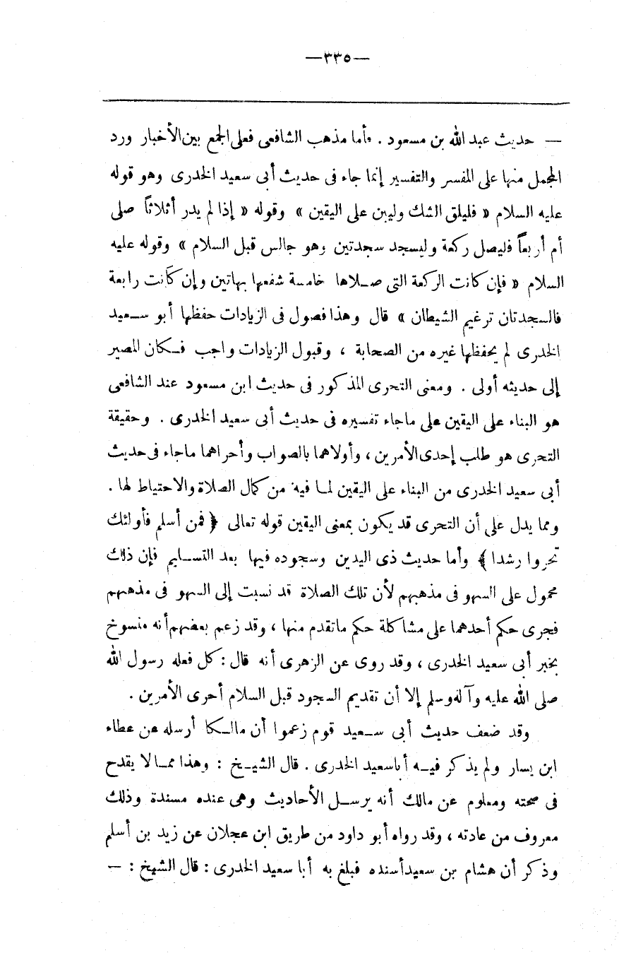 حَدِيث اِبْن مَسْعُود . فَأَمَّا مَذْهَب الشَّافِعِيّ فَعَلَى الْجَمْع بَيْن الْأَخْبَار وَرَدّ الْمُجْمَل مِنْهَا عَلَى الْمُفَسَّر وَالتَّفْسِير إِنَّمَا جَاءَ فِي حَدِيث أَبِي سَعِيد الْخُدْرِيِّ وَهُوَ قَوْله عَلَيْهِ السَّلَام " فَلْيُلْقِ الشَّكّ وَلْيَبْنِ عَلَى الْيَقِين " وَقَوْله " إِذَا لَمْ يَدْرِ أَثَلَاثًا صَلَّى أَمْ أَرْبَعًا فَلْيُصَلِّ رَكْعَة وَلْيَسْجُدْ سَجْدَتَيْنِ وَهُوَ جَالِس قَبْل السَّلَام " وَقَوْله عَلَيْهِ السَّلَام " فَإِنْ كَانَتْ الرَّكْعَة الَّتِي صَلَّاهَا خَامِسَة شَفَعَهَا بِهَاتَيْنِ وَإِنْ كَانَتْ رَابِعَة فَالسَّجْدَتَانِ تَرْغِيم الشَّيْطَان " قَالَ وَهَذَا فُصُول فِي الزِّيَادَات حَفِظَهَا أَبُو سَعِيد الْخُدْرِيُّ لَمْ يَحْفَظهَا غَيْره مِنْ الصَّحَابَة ، وَقَبُول الزِّيَادَات وَاجِب فَكَانَ الْمَصِير إِلَى حَدِيثه أَوْلَى .