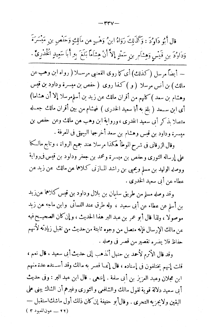 وَقَالَ الزُّرْقَانِيّ فِي شَرْح الْمُوَطَّأ هَكَذَا مُرْسَلًا عِنْد جَمِيع الرُّوَاة ، وَتَابَعَ مَالِكًا عَلَى إِرْسَاله الثَّوْرِيّ وَحَفْص بْن مَيْسَرَة وَمُحَمَّد بْن جَعْفَر وَدَاوُد بْن قَيْس فِي رِوَايَة وَوَصَلَهُ الْوَلِيد بْن مُسْلِم وَيَحْيَى بْن رَاشِد الْمَازِنِيّ كِلَاهُمَا عَنْ مَالِك عَنْ زَيْد عَنْ عَطَاء عَنْ أَبِي سَعِيد الْخُدْرِيِّ .