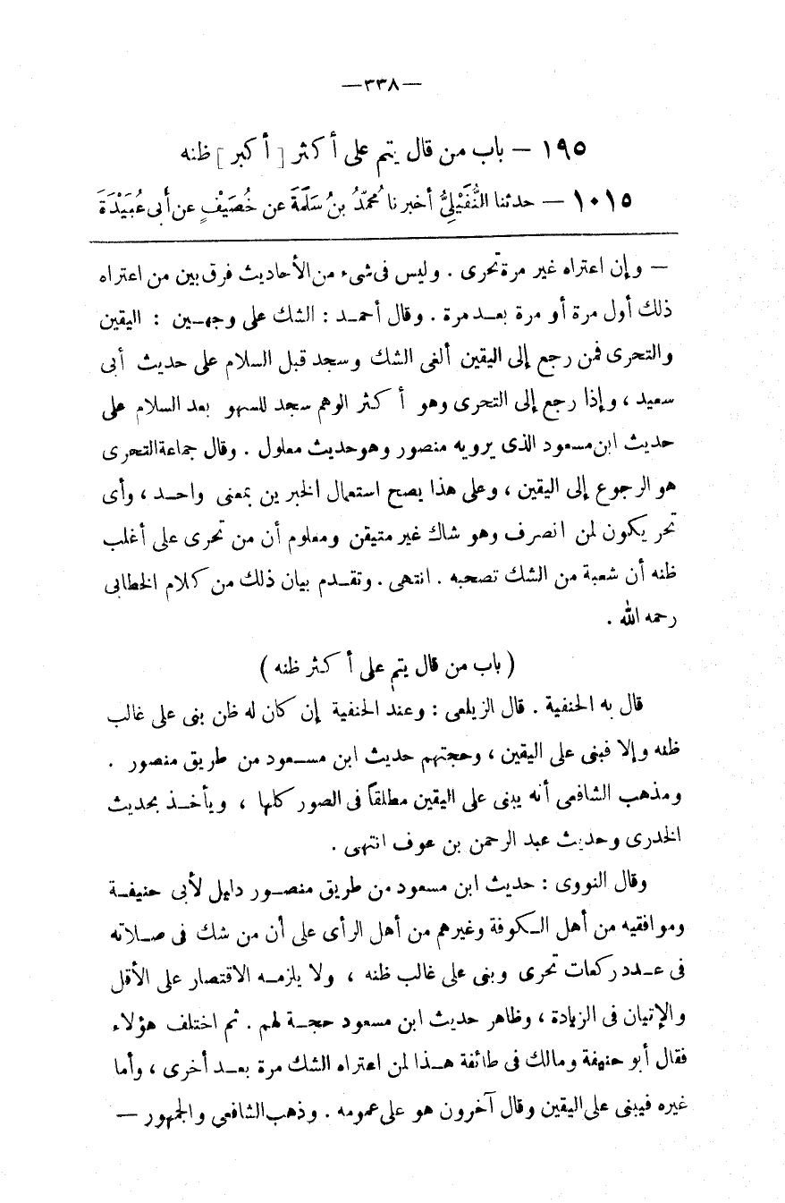 قَالَ النَّوَوِيّ : حَدِيث اِبْن مَسْعُود مِنْ طَرِيق مَنْصُور دَلِيل لِأَبِي حَنِيفَة وَمُوَافِقِيهِ مِنْ أَهْل الْكُوفَة وَغَيْرهمْ مِنْ أَهْل الرَّأْي عَلَى أَنَّ مَنْ شَكَّ فِي صَلَاته فِي عَدَد رَكَعَات تَحَرَّى وَبَنَى عَلَى غَالِب ظَنّه ، وَلَا يَلْزَمهُ الِاقْتِصَار عَلَى الْأَقَلّ وَالْإِتْيَان فِي الزِّيَادَة ، وَظَاهِر حَدِيث اِبْن مَسْعُود حُجَّةٌ لَهُمْ . ثُمَّ اِخْتَلَفَ هَؤُلَاءِ فَقَالَ أَبُو حَنِيفَة وَمَالِك فِي طَائِفَة هَذَا لِمَنْ اِعْتَرَاهُ الشَّكّ مَرَّة بَعْد أُخْرَى ، وَأَمَّا غَيْره فَيَبْنِي عَلَى الْيَقِين وَقَالَ آخَرُونَ هُوَ عَلَى عُمُومِهِ . وَذَهَبَ الشَّافِعِيّ وَالْجُمْهُور@