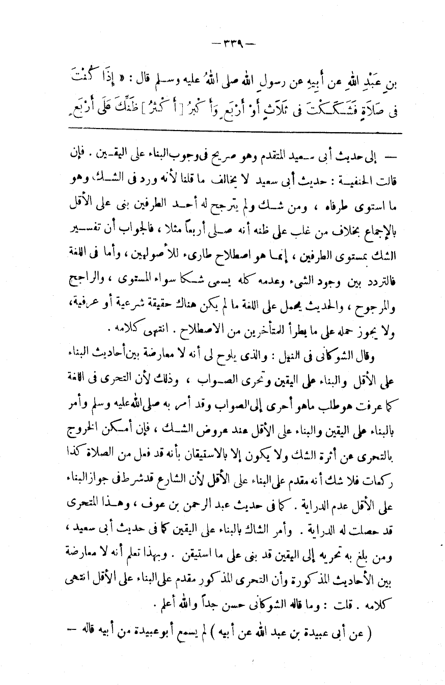 إِلَى حَدِيث أَبِي سَعِيد الْمُتَقَدِّم وَهُوَ صَرِيحٌ فِي وُجُوب الْبِنَاء عَلَى الْيَقِين . فَإِنْ قَالَتْ الْحَنَفِيَّة : حَدِيث أَبِي سَعِيد لَا يُخَالِف مَا قُلْنَا لِأَنَّهُ وَرَدَ فِي الشَّكّ وَهُوَ مَا اِسْتَوَى طَرَفَاهُ ، وَمَنْ شَكَّ وَلَمْ يَتَرَجَّح لَهُ أَحَد الطَّرَفَيْنِ بَنَى عَلَى الْأَقَلّ بِالْإِجْمَاعِ بِخِلَافِ مَنْ غَلَبَ عَلَى ظَنّه أَنَّهُ صَلَّى أَرْبَعًا مَثَلًا ، فَالْجَوَاب أَنَّ تَفْسِير الشَّكّ بِمُسْتَوِي الطَّرَفَيْنِ ، إِنَّمَا هُوَ اِصْطِلَاح طَارِئٌ لِلْأُصُولِيِّينَ ، وَأَمَّا فِي اللُّغَة فَالتَّرَدُّد بَيْن وُجُود الشَّيْء وَعَدَمه كُلّه يُسَمَّى شَكًّا سَوَاء الْمُسْتَوِي ، وَالرَّاجِح وَالْمَرْجُوح ، وَالْحَدِيث يُحْمَل عَلَى اللُّغَة مَا لَمْ يَكُنْ هُنَاكَ حَقِيقَة شَرْعِيَّة أَوْ عُرْفِيَّة ، وَلَا يَجُوز حَمْله عَلَى مَا يَطْرَأ لِلْمُتَأَخِّرِينَ مِنْ الِاصْطِلَاح . اِنْتَهَى كَلَامُهُ .