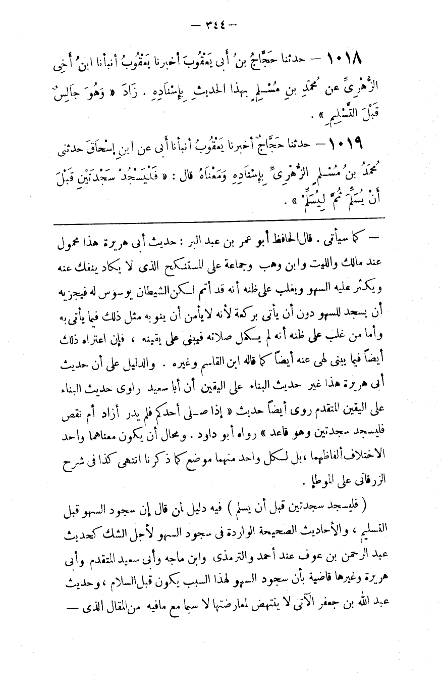 كَمَا سَيَأْتِي . قَالَ الْحَافِظ أَبُو عُمَر بْن عَبْد الْبَرّ : حَدِيث أَبِي هُرَيْرَة هَذَا مَحْمُول عِنْد مَالِك وَاللَّيْث وَابْن وَهْب وَجَمَاعَة عَلَى الْمُسْتَنْكَح الَّذِي لَا يَكَاد يَنْفَكّ عَنْهُ وَيَكْثُر عَلَيْهِ السَّهْو وَيَغْلِب عَلَى ظَنّه أَنَّهُ قَدْ أَتَمَّ لَكِنَّ الشَّيْطَان يُوَسْوِس لَهُ فَيَجْزِيه أَنْ يَسْجُد لِلسَّهْوِ دُون أَنْ يَأْتِي بِرَكْعَةٍ لِأَنَّهُ لَا يَأْمَن أَنْ يَنُوبهُ مِثْل ذَلِكَ فِيمَا يَأْتِي بِهِ وَأَمَّا مَنْ غَلَبَ عَلَى ظَنّه أَنَّهُ لَمْ يُكْمِل صَلَاته فَيَبْنِي عَلَى يَقِينه ، فَإِنْ اِعْتَرَاهُ ذَلِكَ أَيْضًا فِيمَا يَبْنِي لَهَى عَنْهُ أَيْضًا كَمَا قَالَهُ اِبْن الْقَاسِم وَغَيْرُهُ . وَالدَّلِيل عَلَى أَنَّ حَدِيث أَبِي هُرَيْرَة هَذَا غَيْر حَدِيث الْبِنَاء عَلَى الْيَقِين أَنَّ أَبَا سَعِيد رَاوِي حَدِيث الْبِنَاء عَلَى الْيَقِين الْمُتَقَدِّم رَوَى أَيْضًا حَدِيث " إِذَا صَلَّى أَحَدكُمْ فَلَمْ يَدْرِ أَزَادَ أَمْ نَقَصَ فَلْيَسْجُدْ سَجْدَتَيْنِ وَهُوَ قَاعِد " رَوَاهُ أَبُو دَاوُدَ . وَمُحَال أَنْ يَكُون مَعْنَاهُمَا وَاحِد لِاخْتِلَافِ أَلْفَاظهمَا ، بَلْ لِكُلّ وَاحِد مِنْهُمَا مَوْضِع كَمَا ذَكَرْنَا اِنْتَهَى كَذَا فِي شَرْح الزُّرْقَانِيّ عَلَى الْمُوَطَّأ .