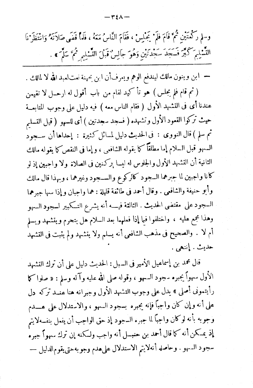 قَالَ مُحَمَّد بْن إِسْمَاعِيل الْأَمِير فِي السَّيْل : الْحَدِيث دَلِيل عَلَى أَنَّ تَرْك التَّشَهُّد الْأَوَّل سَهْوًا يَجْبُرهُ سُجُود السَّهْو ، وَقَوْله صَلَّى اللَّه عَلَيْهِ وَسَلَّمَ : " صَلُّوا كَمَا رَأَيْتُمُونِي أُصَلِّي " يَدُلّ عَلَى وُجُوب التَّشَهُّد الْأَوَّل وَجُبْرَانه هُنَا عِنْد تَرْكه دَلَّ عَلَى أَنَّهُ وَإِنْ كَانَ وَاجِبًا فَإِنَّهُ يَجْبُرهُ بِسُجُودِ السَّهْو ، وَالِاسْتِدْلَال عَلَى عَدَم وُجُوبه بِأَنَّهُ لَوْ كَانَ وَاجِبًا لَمَا جَبَرَهُ السُّجُود إِذْ حَقّ الْوَاجِب أَنْ يُفْعَل بِنَفْسِهِ لَا يُتَمّ إِذْ يُمْكِن أَنَّهُ كَمَا قَالَ أَحْمَد بْن حَنْبَل أَنَّهُ وَاجِب وَلَكِنَّهُ إِنْ تُرِكَ سَهْوًا جَبَرَهُ سُجُود السَّهْو . وَحَاصِله أَنَّهُ لَا يَتِمّ الِاسْتِدْلَال عَلَى عَدَم وُجُوبه حَتَّى يَقُوم الدَّلِيل@