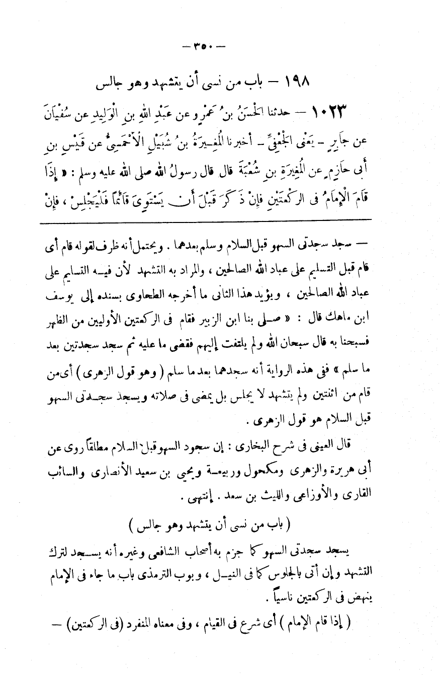 : أَيْ مَنْ قَامَ مِنْ اِثْنَتَيْنِ وَلَمْ يَتَشَهَّد لَا يَجْلِس بَلْ يَمْضِي فِي صَلَاته وَيَسْجُد سَجْدَتَيْ السَّهْو قَبْل السَّلَام وَهُوَ قَوْل الزُّهْرِيّ . قَالَ الْعَيْنِيّ فِي شَرْح الْبُخَارِيّ : إِنَّ سُجُود السَّهْو قَبْل السَّلَام مُطْلَقًا رُوِيَ عَنْ أَبِي هُرَيْرَة وَالزُّهْرِيّ وَمَكْحُول وَرَبِيعَة وَيَحْيَى بْن سَعِيد الْأَنْصَارِيّ وَالسَّائِب الْقَارِي وَالْأَوْزَاعِيِّ وَاللَّيْث بْن سَعْد . اِنْتَهَى .