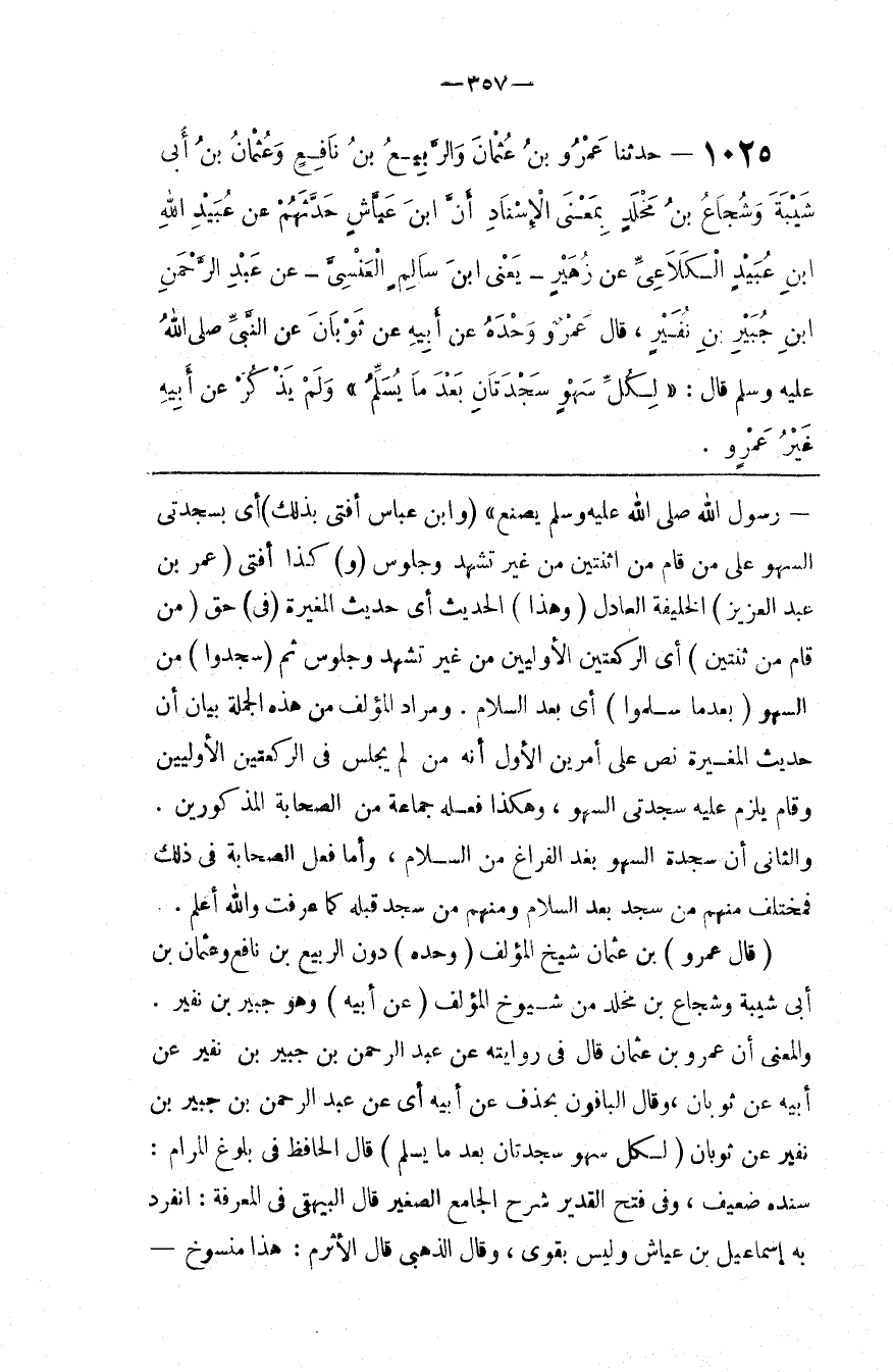 أَيْ بَعْد السَّلَام . وَمُرَادُ الْمُؤَلِّف مِنْ هَذِهِ الْجُمْلَة بَيَان أَنَّ حَدِيث الْمُغِيرَة نَصَّ عَلَى أَمْرَيْنِ الْأَوَّل أَنَّهُ مَنْ لَمْ يَجْلِس فِي الرَّكْعَتَيْنِ الْأُولَيَيْنِ وَقَامَ يَلْزَم عَلَيْهِ سَجْدَتَا السَّهْو ، وَهَكَذَا فَعَلَهُ جَمَاعَة مِنْ الصَّحَابَة الْمَذْكُورِينَ . وَالثَّانِي أَنَّ سَجْدَة السَّهْو بَعْد الْفَرَاغ مِنْ السَّلَام ، وَأَمَّا فِعْل الصَّحَابَة فِي ذَلِكَ فَمُخْتَلِفٌ مِنْهُمْ مَنْ سَجَدَ بَعْد السَّلَام وَمِنْهُمْ مَنْ سَجَدَ قَبْله كَمَا عَرَفْت وَاَللَّه أَعْلَم .