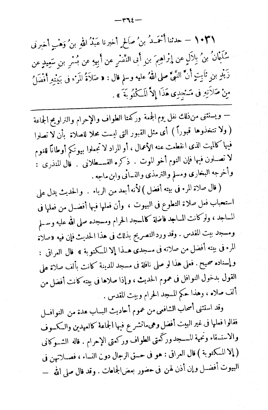 وَقَدْ اِسْتَثْنَى أَصْحَاب الشَّافِعِيّ مِنْ عُمُوم أَحَادِيث الْبَاب عِدَّة مِنْ النَّوَافِل فَقَالُوا فِعْلهَا فِي غَيْر الْبَيْت أَفْضَل وَهِيَ مَا تُشْرَع فِيهَا الْجَمَاعَة كَالْعِيدَيْنِ وَالْكُسُوف وَالِاسْتِسْقَاء وَتَحِيَّة الْمَسْجِد وَرَكْعَتَيْ الطَّوَاف وَرَكْعَتَيْ الْإِحْرَام . قَالَهُ الشَّوْكَانِيُّ