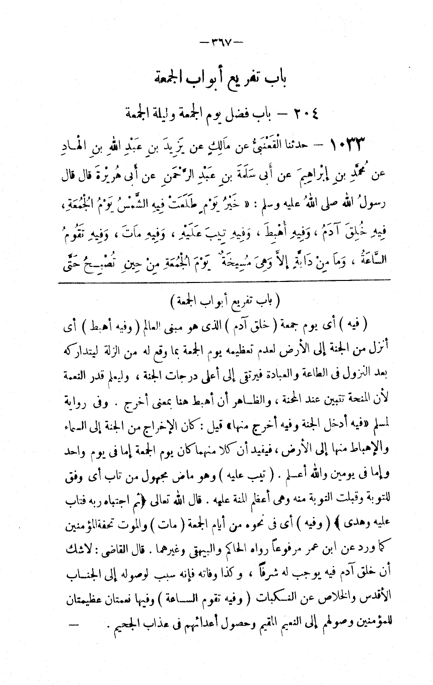 : أَيْ أُنْزِلَ مِنْ الْجَنَّة إِلَى الْأَرْض لِعَدَمِ تَعْظِيمه يَوْم الْجُمُعَة بِمَا وَقَعَ لَهُ مِنْ الزَّلَّة لِيَتَدَارَكَهُ بَعْد النُّزُول فِي الطَّاعَة وَالْعِبَادَة فَيَرْتَقِي إِلَى أَعْلَى دَرَجَات الْجَنَّة ، وَلِيَعْلَم قَدْر النِّعْمَة لِأَنَّ الْمِنْحَة تَتَبَيَّن عِنْد الْمِحْنَة ، وَالظَّاهِر أَنَّ أُهْبِطَ هُنَا بِمَعْنَى أُخْرِجَ . وَفِي رِوَايَة لِمُسْلِمٍ " فِيهِ أُدْخِلَ الْجَنَّة وَفِيهِ أُخْرِجَ مِنْهَا " قِيلَ : كَانَ الْإِخْرَاج مِنْ الْجَنَّة إِلَى السَّمَاء وَالْإِهْبَاط مِنْهَا إِلَى الْأَرْض ، فَيُفِيد أَنَّ كُلًّا مِنْهُمَا كَانَ يَوْم الْجُمُعَة إِمَّا فِي يَوْم وَاحِد وَإِمَّا فِي يَوْمَيْنِ وَاللَّهُ أَعْلَم .