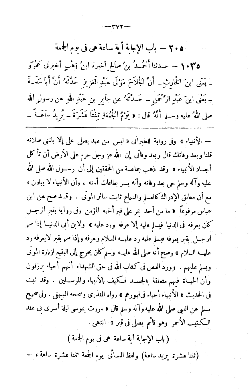 الْأَنْبِيَاء " وَفِي رِوَايَة لِلطَّبَرَانِيِّ " لَيْسَ مِنْ عَبْد يُصَلِّي عَلَيَّ إِلَّا بَلَغَنِي صَلَاته قُلْنَا وَبَعْد وَفَاتك قَالَ وَبَعْد وَفَاتِي إِنَّ اللَّه عَزَّ وَجَلَّ حَرَّمَ عَلَى الْأَرْض أَنْ تَأْكُل أَجْسَاد الْأَنْبِيَاء " وَقَدْ ذَهَبَ جَمَاعَة مِنْ الْمُحَقِّقِينَ إِلَى أَنَّ رَسُول اللَّه صَلَّى اللَّه عَلَيْهِ وَآله وَسَلَّمَ حَيٌّ بَعْد وَفَاته وَأَنَّهُ يُسَرُّ بِطَاعَاتِ أُمَّته ، وَأَنَّ الْأَنْبِيَاء لَا يَبْلُونَ ، مَعَ أَنَّ مُطْلَق الْإِدْرَاك كَالْعِلْمِ وَالسَّمَاع ثَابِت لِسَائِرِ الْمَوْتَى . وَقَدْ صَحَّ عَنْ اِبْن عَبَّاس مَرْفُوعًا " مَا مِنْ أَحَد يَمُرّ عَلَى قَبْر أَخِيهِ الْمُؤْمِن وَفِي رِوَايَة بِقَبْرِ الرَّجُل كَانَ يَعْرِفهُ فِي الدُّنْيَا فَيُسَلِّم عَلَيْهِ إِلَّا عَرَفَهُ وَرَدَّ عَلَيْهِ " وَلِابْنِ أَبِي الدُّنْيَا إِذَا مَرَّ الرَّجُل بِقَبْر يَعْرِفهُ فَيُسَلِّم عَلَيْهِ السَّلَام وَعَرَفَهُ وَإِذَا مَرَّ بِقَبْر لَا يَعْرِفهُ رَدَّ عَلَيْهِ السَّلَام " وَصَحَّ أَنَّهُ صَلَّى اللَّه عَلَيْهِ وَسَلَّمَ كَانَ يَخْرُج إِلَى الْبَقِيع لِزِيَارَةِ الْمَوْتَى وَيُسَلِّم عَلَيْهِمْ . وَوَرَدَ النَّصّ فِي كِتَاب اللَّه فِي حَقّ الشُّهَدَاء أَنَّهُمْ أَحْيَاء يُرْزَقُونَ وَأَنَّ الْحَيَاة فِيهِمْ مُتَعَلِّقَة بِالْجَسَدِ فَكَيْفَ بِالْأَنْبِيَاءِ وَالْمُرْسَلِينَ . وَقَدْ ثَبَتَ فِي الْحَدِيث " الْأَنْبِيَاء أَحْيَاء فِي قُبُورهمْ " رَوَاهُ الْمُنْذِرِيُّ وَصَحَّحَهُ الْبَيْهَقِيُّ . وَفِي صَحِيح مُسْلِم عَنْ النَّبِيّ صَلَّى اللَّه عَلَيْهِ وَسَلَّمَ قَالَ " مَرَرْت بِمُوسَى لَيْلَة أُسْرِيَ بِي عِنْد الْكَثِيب الْأَحْمَر وَهُوَ قَائِم يُصَلِّي فِي قَبْرٍ " اِنْتَهَى .