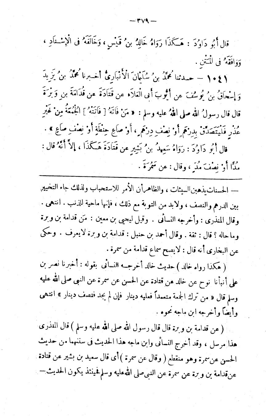 : حَدِيث خَالِد أَخْرَجَهُ النَّسَائِيّ بِقَوْلِهِ : أَخْبَرَنَا نَصْر بْن عَلِيّ أَنْبَأَنَا نُوحَ عَنْ خَالِد عَنْ قَتَادَةَ عَنْ الْحَسَن عَنْ سَمُرَة عَنْ النَّبِيّ صَلَّى اللَّه عَلَيْهِ وَسَلَّمَ قَالَ " مَنْ تَرَكَ الْجُمُعَة مُتَعَمِّدًا فَعَلَيْهِ دِينَار فَإِنْ لَمْ يَجِد فَنِصْف دِينَار " اِنْتَهَى وَأَيْضًا وَأَخْرَجَ اِبْنُ مَاجَهْ نَحْوَهُ .