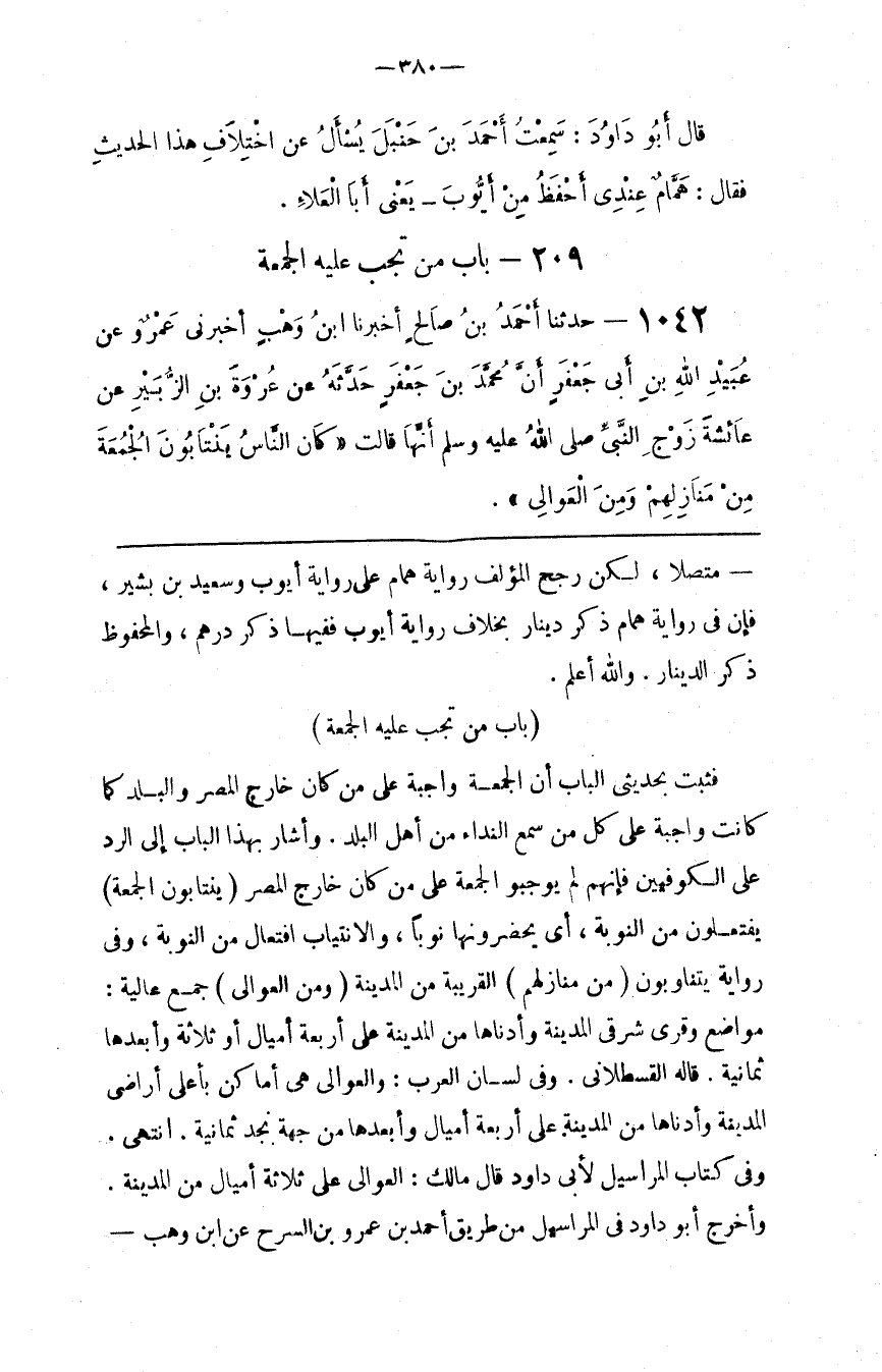 فَثَبَتَ بِحَدِيثَيْ الْبَاب أَنَّ الْجُمُعَة وَاجِبَة عَلَى مَنْ كَانَ خَارِج الْمِصْر وَالْبَلَد كَمَا كَانَتْ وَاجِبَة عَلَى كُلّ مَنْ سَمِعَ النِّدَاء مِنْ أَهْل الْبَلَد . وَأَشَارَ بِهَذَا الْبَاب إِلَى الرَّدّ عَلَى الْكُوفِيِّينَ فَإِنَّهُمْ لَمْ يُوجِبُوا الْجُمُعَة عَلَى مَنْ كَانَ خَارِج الْمِصْر .