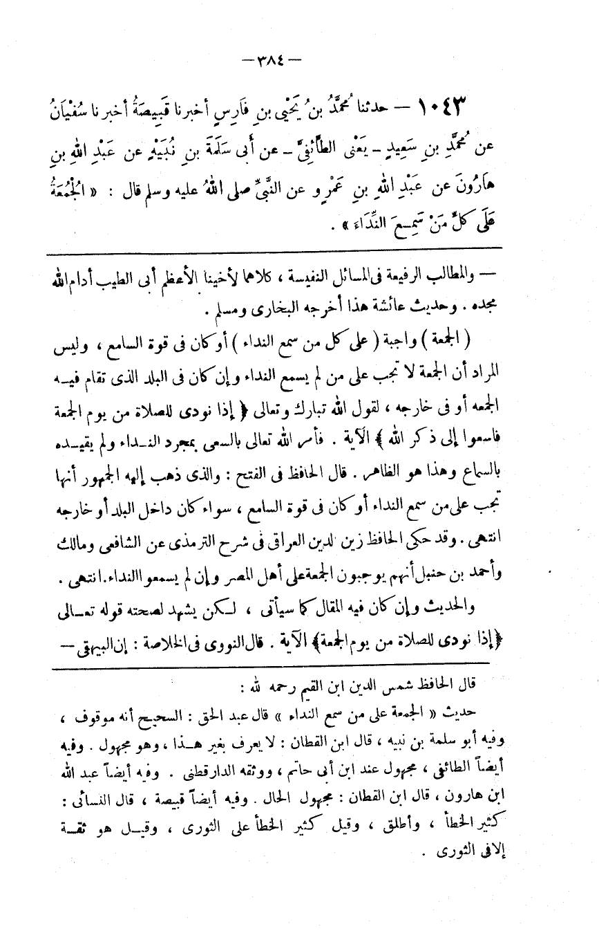 قال الحافظ شمس الدين ابن القيم رحمه الله حديث الجمعة على من سمع النداء قال عبد الحق الصحيح أنه موقوف وفيه أبو سلمة بن نبيه قال ابن القطان لا يعرف بغير هذا وهو مجهول وفيه أيضا الطائي مجهول عند ابن أبي حاتم ووثقة الدارقطني وفيه أيضا عبد الله بن هارون قال ابن القطان مجهول الحال وفية أيضا قبيصة قال النسائي كثير الخطأ وأطلق وقيل كثير الخطأ على الثوري وقيل هو إلا في الثوري