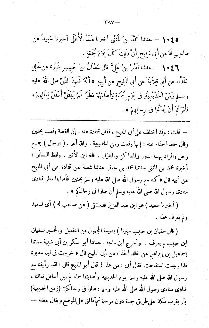 : بِصِيغَةِ الْمَجْهُول مِنْ التَّفْعِيل وَالْمُخْبِر لِسُفْيَان بْن حَبِيب لَمْ يُعْرَف . وَأَخْرَجَ اِبْن مَاجَهْ : حَدَّثَنَا أَبُو بَكْر بْن أَبِي شَيْبَة حَدَّثَنَا إِسْمَاعِيل بْن إِبْرَاهِيم عَنْ خَالِد الْحَذَّاء عَنْ أَبِي الْمُلَيْح قَالَ " خَرَجْت فِي لَيْلَة مَطِيرَة فَلَمَّا رَجَعْت اِسْتَفْتَحْت فَقَالَ أَبِي : مَنْ هَذَا ؟ قَالَ أَبُو الْمُلَيْح قَالَ : لَقَدْ رَأَيْتنَا مَعَ رَسُول اللَّه صَلَّى اللَّه عَلَيْهِ وَسَلَّمَ يَوْم الْحُدَيْبِيَة وَأَصَابَتْنَا سَمَاء لَمْ تَبُلّ أَسَافِل نِعَالنَا ، فَنَادَى مُنَادِي رَسُول اللَّه صَلَّى اللَّه عَلَيْهِ وَسَلَّمَ : صَلُّوا فِي رِحَالكُمْ "