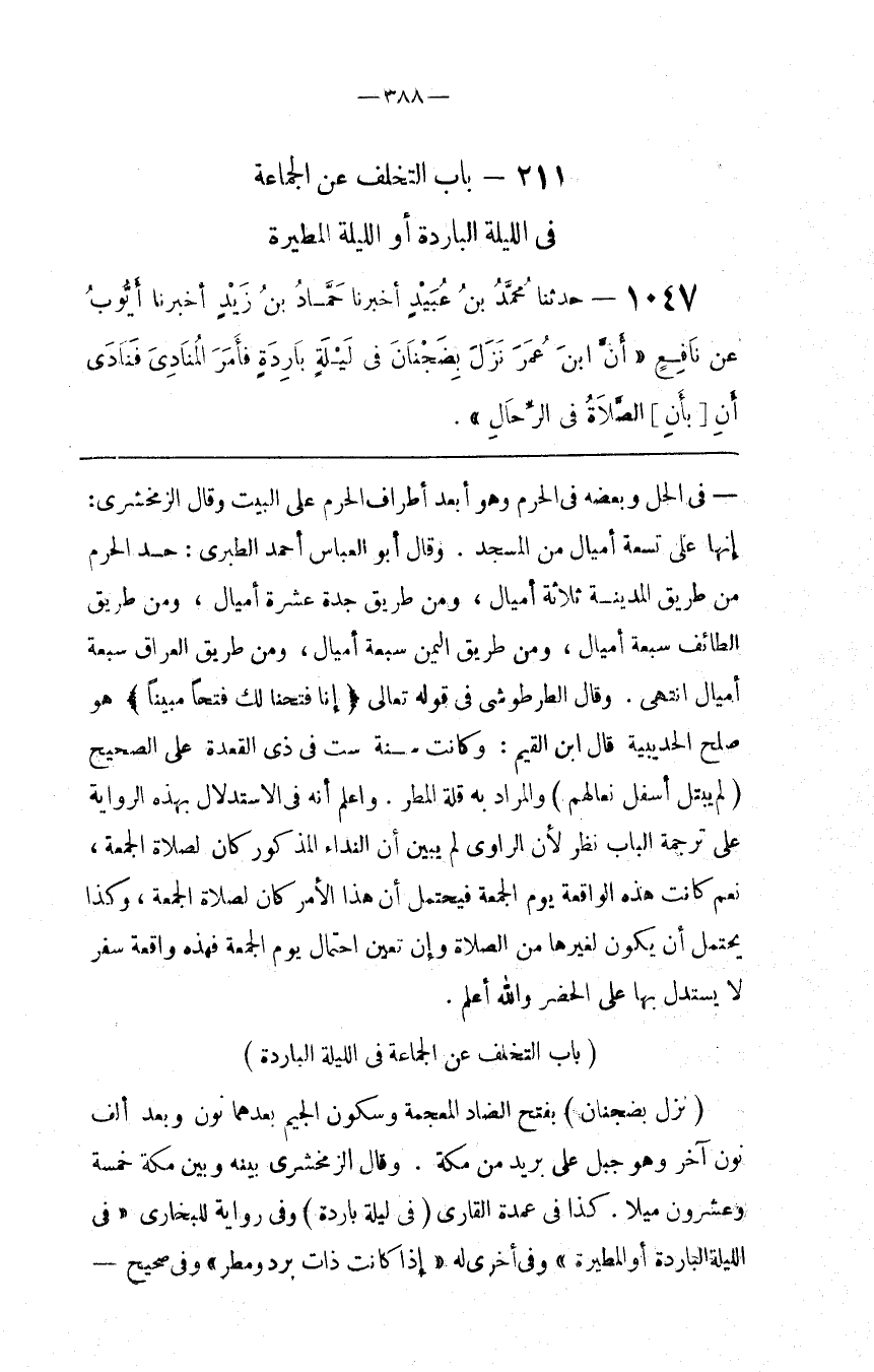وَفِي رِوَايَة لِلْبُخَارِيِّ " فِي اللَّيْلَة الْبَارِدَة أَوْ الْمَطِيرَة " وَفِي أُخْرَى لَهُ " إِذَا كَانَتْ ذَات بَرْد وَمَطَر " وَفِي صَحِيح@