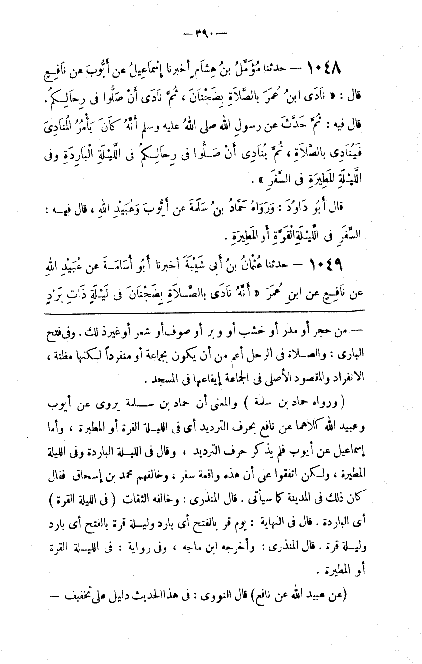: وَالْمَعْنَى أَنَّ حَمَّاد بْن سَلَمَة يَرْوِي عَنْ أَيُّوب وَعُبَيْد اللَّه كِلَاهُمَا عَنْ نَافِع بِحَرْفِ التَّرْدِيد أَيْ فِي اللَّيْلَة الْقَرَّة أَوْ الْمَطِيرَة ، وَأَمَّا إِسْمَاعِيل عَنْ أَيُّوب فَلَمْ يَذْكُر حَرْف التَّرْدِيد ، وَقَالَ فِي اللَّيْلَة الْبَارِدَة وَفِي اللَّيْلَة الْمَطِيرَة ، وَلَكِنْ اِتَّفَقُوا عَلَى أَنَّ هَذِهِ وَاقِعَة سَفَر ، وَخَالَفَهُمْ مُحَمَّد بْن إِسْحَاق فَقَالَ كَانَ ذَلِكَ فِي الْمَدِينَة كَمَا سَيَأْتِي .