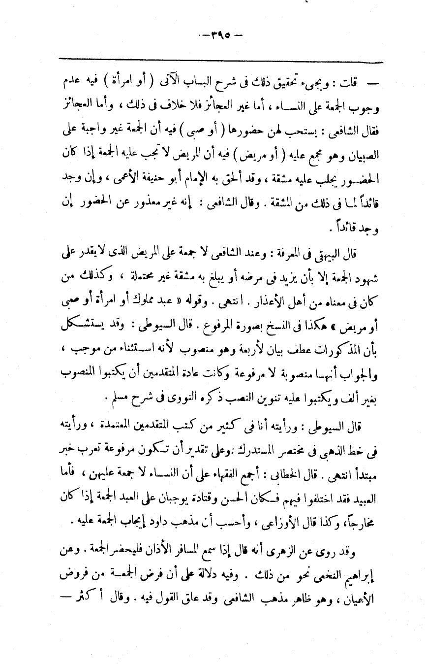 قَالَ السُّيُوطِيُّ : وَرَأَيْته أَنَا فِي كَثِير مِنْ كُتُب الْمُتَقَدِّمِينَ الْمُعْتَمَدَة ، وَرَأَيْته فِي خَطّ الذَّهَبِيّ فِي مُخْتَصَر الْمُسْتَدْرَك : وَعَلَى تَقْدِير أَنْ تَكُون مَرْفُوعَة تُعْرَب خَبَر مُبْتَدَأ اِنْتَهَى . قَالَ الْخَطَّابِيُّ : أَجْمَع الْفُقَهَاء عَلَى أَنَّ النِّسَاء لَا جُمُعَة عَلَيْهِنَّ ، فَأَمَّا الْعَبِيد فَقَدْ اِخْتَلَفُوا فِيهِمْ فَكَانَ الْحَسَن وَقَتَادَة يُوجِبَانِ عَلَى الْعَبْد الْجُمُعَة إِذَا كَانَ مُخَارِجًا ، وَكَذَا قَالَ الْأَوْزَاعِيُّ ، وَأَحْسَب أَنَّ مَذْهَب دَاوُدَ إِيجَاب الْجُمُعَة عَلَيْهِ .