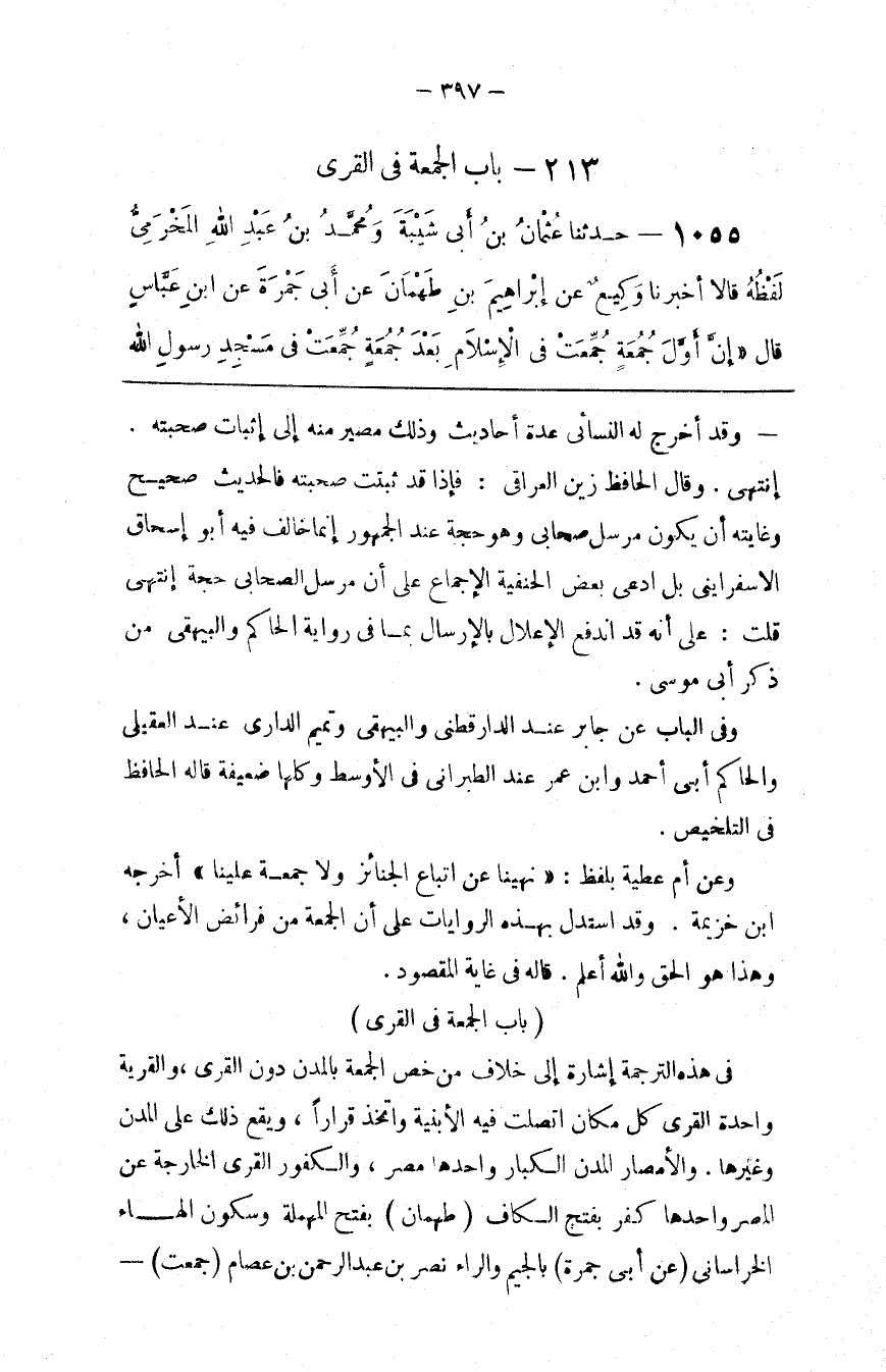 فِي هَذِهِ التَّرْجَمَة إِشَارَة إِلَى خِلَاف مَنْ خَصَّ الْجُمُعَة بِالْمُدُنِ دُون الْقُرَى ، وَالْقَرْيَة وَاحِدَة الْقُرَى كُلّ مَكَان اِتَّصَلَتْ فِيهِ الْأَبْنِيَة وَاُتُّخِذَ قَرَارًا ، وَيَقَع ذَلِكَ عَلَى الْمُدُن وَغَيْرهَا . وَالْأَمْصَار الْمُدُن الْكِبَار وَاحِدهَا مِصْر ، وَالْكُفُور الْقُرَى الْخَارِجَة عَنْ الْمِصْر وَاحِدهَا كَفْر بِفَتْحِ الْكَاف .