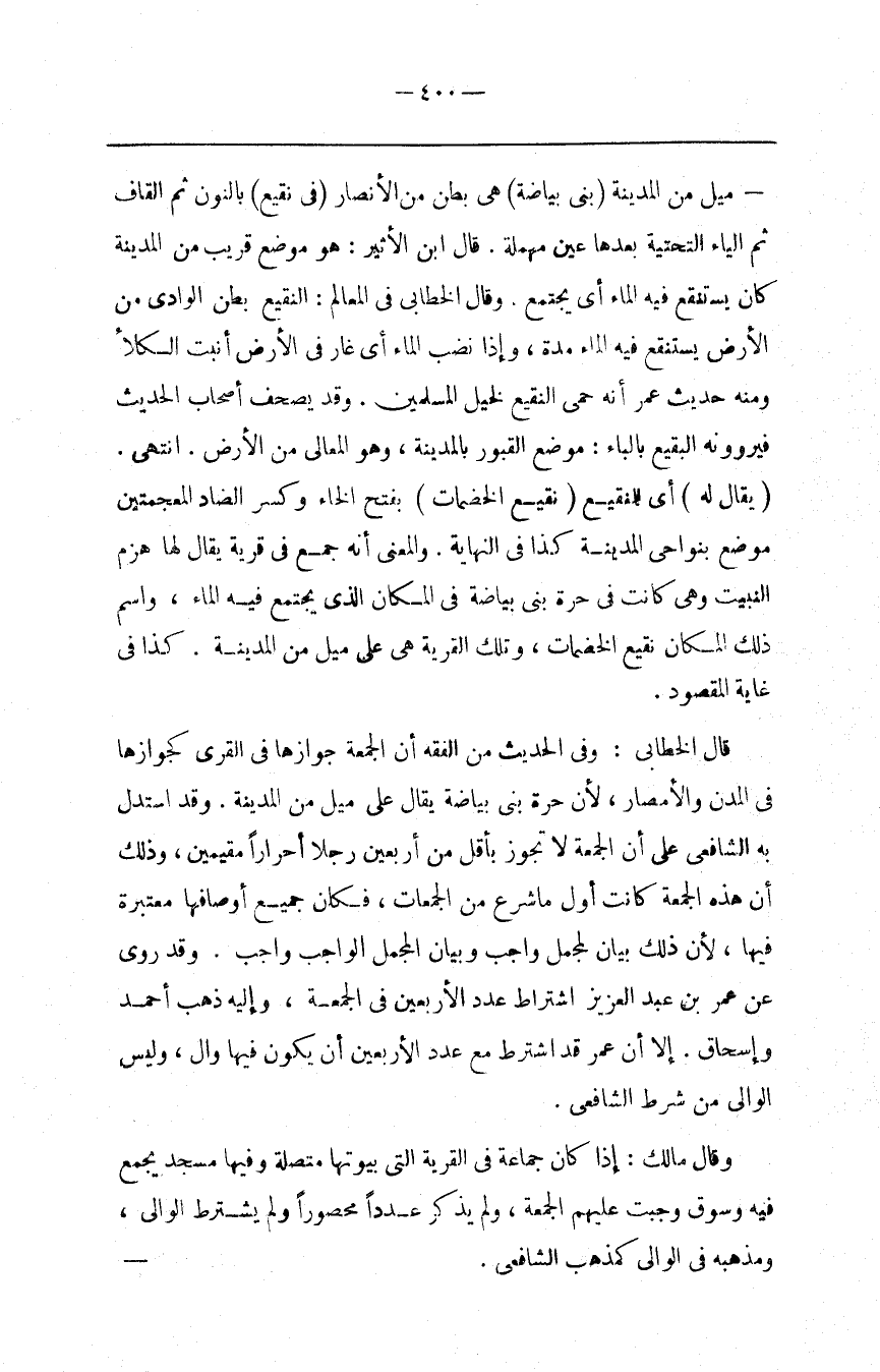 قَالَ الْخَطَّابِيُّ : وَفِي الْحَدِيث مِنْ الْفِقْه أَنَّ الْجُمُعَة جَوَازهَا فِي الْقُرَى كَجَوَازِهِ فِي الْمُدُن وَالْأَمْصَار ، لِأَنَّ حَرَّة بَنِي بَيَاضَة يُقَال عَلَى مِيل مِنْ الْمَدِينَة . وَقَدْ اِسْتَدَلَّ بِهِ الشَّافِعِيّ عَلَى أَنَّ الْجُمُعَة لَا تَجُوز بِأَقَلّ مِنْ أَرْبَعِينَ رَجُلًا أَحْرَارًا مُقِيمِينَ ، وَذَلِكَ أَنَّ هَذِهِ الْجُمُعَة كَانَتْ أَوَّل مَا شُرِعَ مِنْ الْجُمُعَات ، فَكَانَ جَمِيع أَوْصَافهَا مُعْتَبَرَة فِيهَا ، لِأَنَّ ذَلِكَ بَيَانٌ لِمُجْمَل وَاجِب وَبَيَانُ الْمُجْمَل الْوَاجِبِ وَاجِبٌ . وَقَدْ رُوِيَ عَنْ عُمَر بْن عَبْد الْعَزِيز اِشْتِرَاط عَدَد الْأَرْبَعِينَ فِي الْجُمُعَة ، وَإِلَيْهِ ذَهَبَ أَحْمَدُ وَإِسْحَاقُ . إِلَّا أَنَّ عُمَر قَدْ اِشْتَرَطَ مَعَ عَدَد الْأَرْبَعِينَ أَنْ يَكُون فِيهَا وَالٍ ، وَلَيْسَ الْوَالِي مِنْ شَرْط الشَّافِعِيّ .