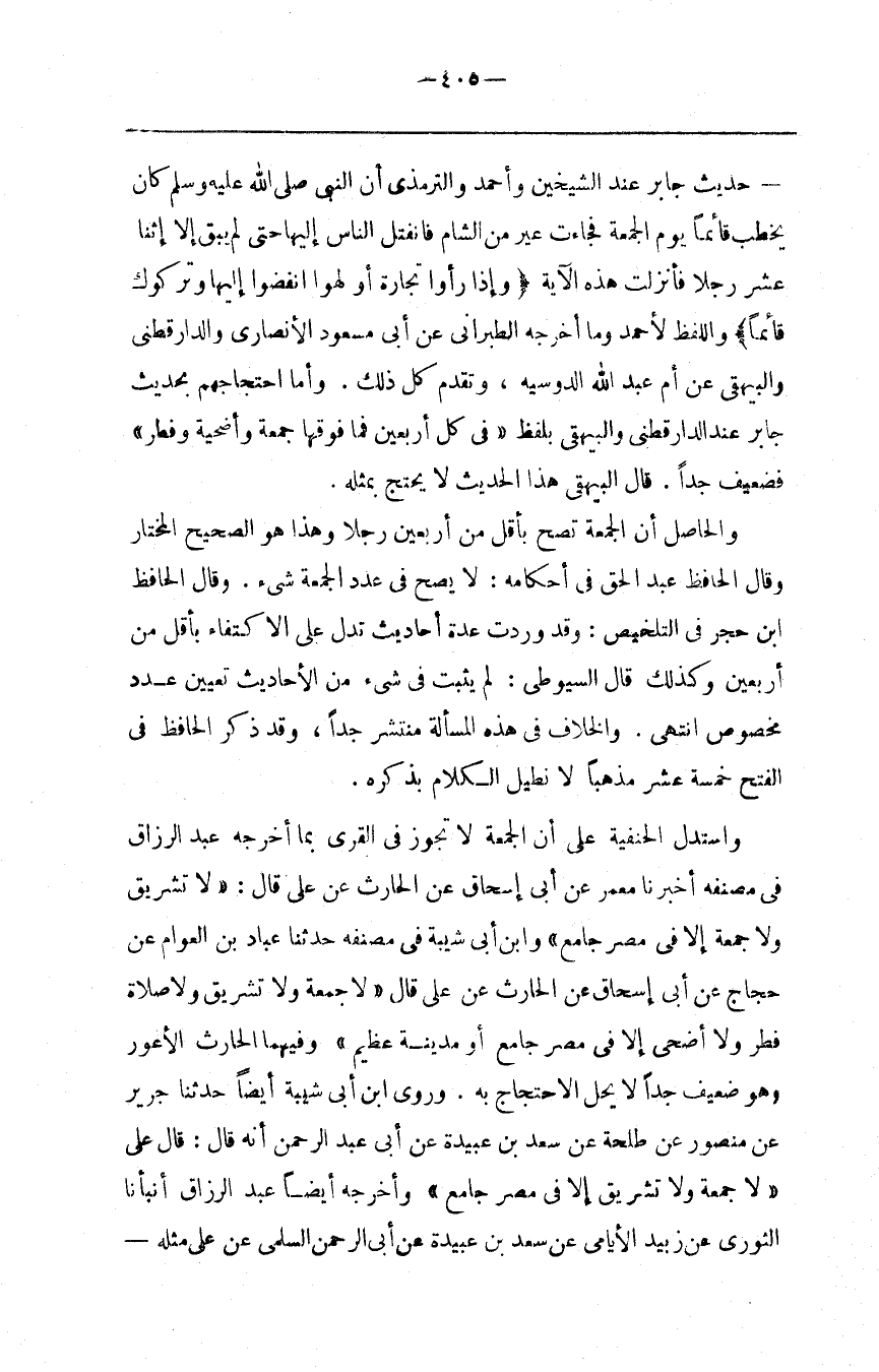 وَاسْتَدَلَّ الْحَنَفِيَّة عَلَى أَنَّ الْجُمُعَة لَا تَجُوز فِي الْقُرَى بِمَا أَخْرَجَهُ عَبْد الرَّزَّاق فِي مُصَنَّفه أَخْبَرَنَا مَعْمَر عَنْ أَبِي إِسْحَاق عَنْ الْحَارِث عَنْ عَلِيّ قَالَ : " لَا تَشْرِيق وَلَا جُمُعَة إِلَّا فِي مِصْر جَامِع " وَابْن أَبِي شَيْبَة فِي مُصَنَّفه حَدَّثَنَا عَبَّاد بْن الْعَوَامّ عَنْ حَجَّاج عَنْ أَبِي إِسْحَاق عَنْ الْحَارِث عَنْ عَلِيّ قَالَ " لَا جُمُعَة وَلَا تَشْرِيق وَلَا صَلَاة فِطْر وَلَا أَضْحًى إِلَّا فِي مِصْر جَامِع أَوْ مَدِينَة عَظِيم " وَفِيهِمَا الْحَارِث الْأَعْوَر وَهُوَ ضَعِيف جِدًّا لَا يَحِلّ الِاحْتِجَاج بِهِ وَرَوَى اِبْن أَبِي شَيْبَة أَيْضًا حَدَّثَنَا جَرِير عَنْ مَنْصُور عَنْ طَلْحَة عَنْ سَعْد بْن عُبَيْدَة عَنْ أَبِي عَبْد الرَّحْمَن أَنَّهُ قَالَ : قَالَ عَلِيّ " لَا جُمُعَة وَلَا تَشْرِيق إِلَّا فِي مِصْر جَامِع " وَأَخْرَجَهُ أَيْضًا عَبْد الرَّزَّاق أَنْبَأَنَا الثَّوْرِيّ عَنْ زُبَيْد الْإيَامِيّ عَنْ سَعْد بْن عُبَيْدَة عَنْ أَبِي الرَّحْمَن السُّلَمِيّ عَنْ عَلِيّ مِثْله@