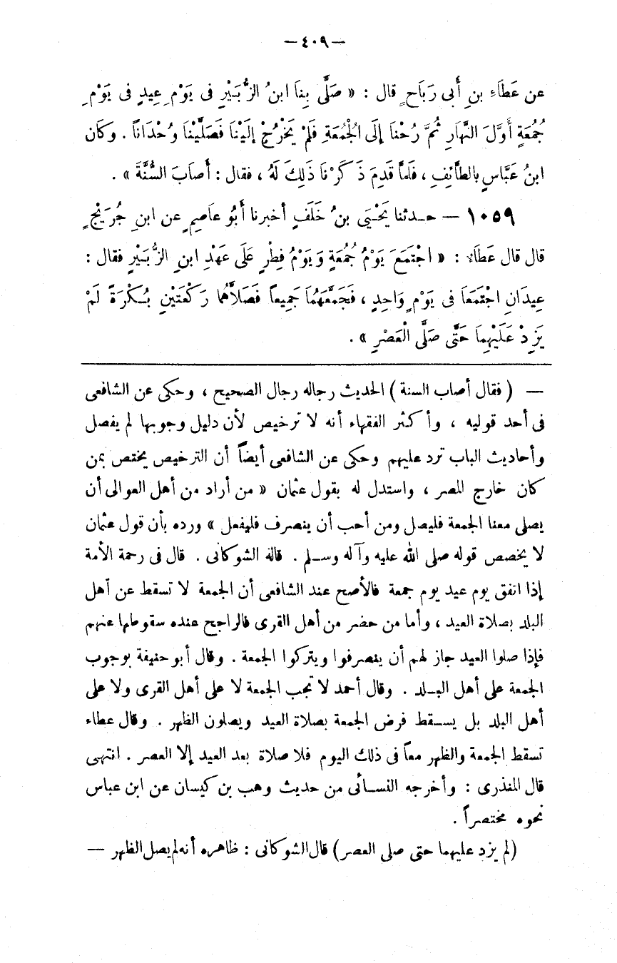 : الْحَدِيث رِجَاله رِجَال الصَّحِيح ، وَحُكِيَ عَنْ الشَّافِعِيّ فِي أَحَد قَوْلَيْهِ ، وَأَكْثَر الْفُقَهَاء أَنَّهُ لَا تَرْخِيص لِأَنَّ دَلِيل وُجُوبهَا لَمْ يُفْصَّل وَأَحَادِيث الْبَاب تَرُدّ عَلَيْهِمْ وَحُكِيَ عَنْ الشَّافِعِيّ أَيْضًا أَنَّ التَّرْخِيص يَخْتَصّ بِمَنْ كَانَ خَارِج الْمِصْر ، وَاسْتَدَلَّ لَهُ بِقَوْلِ عُثْمَان " مَنْ أَرَادَ مِنْ أَهْل الْعَوَالِي أَنْ يُصَلِّي مَعَنَا الْجُمُعَة فَلْيُصَلِّ وَمَنْ أَحَبّ أَنْ يَنْصَرِف فَلْيَفْعَلْ " وَرَدّه بِأَنَّ قَوْل عُثْمَان لَا يُخَصِّص قَوْله صَلَّى اللَّه عَلَيْهِ وَسَلَّمَ . قَالَهُ الشَّوْكَانِيُّ . قَالَ فِي رَحْمَة الْأُمَّة إِذَا اِتَّفَقَ يَوْم عِيد يَوْم جُمُعَة فَالْأَصَحّ عِنْد الشَّافِعِيّ أَنَّ الْجُمُعَة لَا تَسْقُط عَنْ أَهْل الْبَلَد بِصَلَاةِ الْعِيد ، وَأَمَّا مَنْ حَضَرَ مِنْ أَهْل الْقُرَى فَالرَّاجِح عِنْده سُقُوطهَا عَنْهُمْ فَإِذَا صَلَّوْا الْعِيد جَازَ لَهُمْ أَنْ يَنْصَرِفُوا وَيَتْرُكُوا الْجُمُعَة . وَقَالَ أَبُو حَنِيفَة بِوُجُوبِ الْجُمُعَة عَلَى أَهْل الْبَلَدِ . وَقَالَ أَحْمَد لَا تَجِب الْجُمُعَة لَا عَلَى أَهْل الْقُرَى وَلَا عَلَى أَهْل الْبَلَد بَلْ يَسْقُط فَرْض الْجُمُعَة بِصَلَاةِ الْعِيد وَيُصَلُّونَ الظُّهْرَ . وَقَالَ عَطَاء تَسْقُطُ الْجُمُعَة وَالظُّهْر مَعًا فِي ذَلِكَ الْيَوْم فَلَا صَلَاة بَعْد الْعِيد إِلَّا الْعَصْر . اِنْتَهَى قَالَ الْمُنْذِرِيُّ : وَأَخْرَجَهُ النَّسَائِيُّ مِنْ حَدِيث وَهْب بْن كَيْسَانَ عَنْ اِبْن عَبَّاس نَحْوه مُخْتَصَرًا .