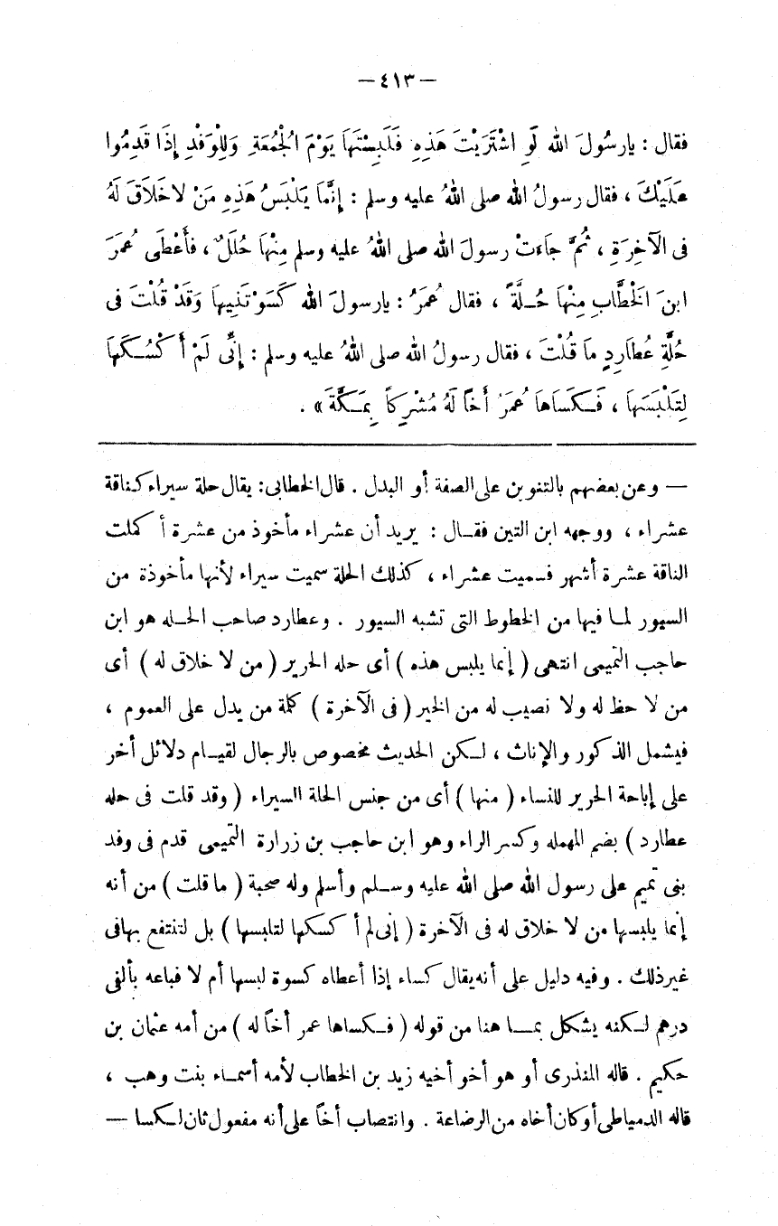 وَعَنْ بَعْضِهِمْ بِالتَّنْوِينِ عَلَى الصِّفَة أَوْ الْبَدَل . قَالَ الْخَطَّابِيُّ : يُقَال حُلَّة سِيَرَاء كَنَاقَةٍ عُشَرَاء ، وَوَجَّهَهُ اِبْن التِّين فَقَالَ : يُرِيد أَنَّ عُشَرَاء مَأْخُوذ مِنْ عَشَرَة أَكْمَلَتْ النَّاقَة عَشَرَة أَشْهُر فَسُمِّيَتْ عُشَرَاء ، كَذَلِكَ الْحُلَّة سُمِّيَتْ سِيَرَاء لِأَنَّهَا مَأْخُوذَة مِنْ السُّيُور لِمَا فِيهَا مِنْ الْخُطُوط الَّتِي تُشْبِه السُّيُور . وَعُطَارِد صَاحِب الْحُلَّة هُوَ اِبْن حَاجِب التَّمِيمِيّ اِنْتَهَى