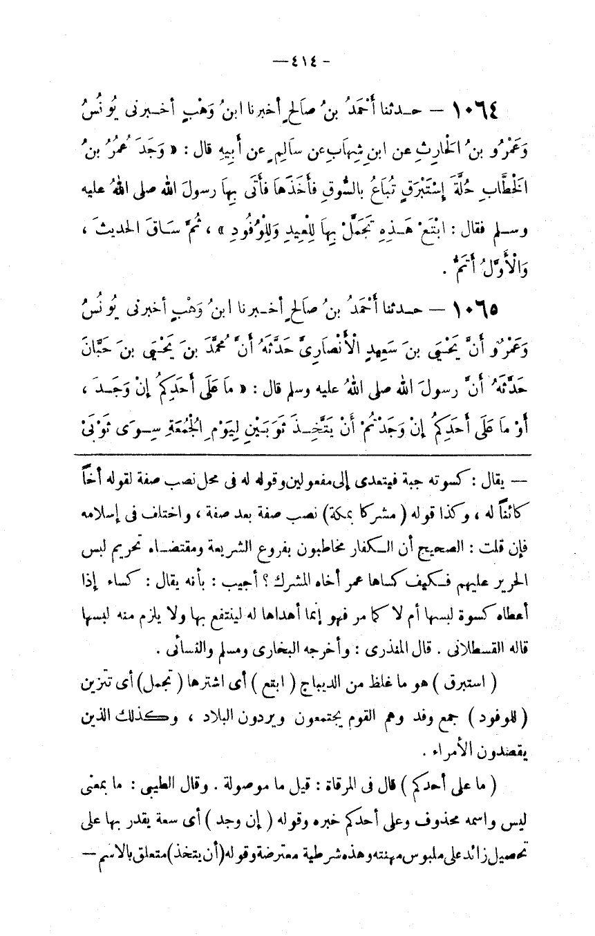 : نُصِبَ صِفَة بَعْد صِفَة ، وَاخْتُلِفَ فِي إِسْلَامه فَإِنْ قُلْت : الصَّحِيح أَنَّ الْكُفَّار مُخَاطَبُونَ بِفُرُوعِ الشَّرِيعَة وَمُقْتَضَاهُ تَحْرِيم لُبْس الْحَرِير عَلَيْهِمْ فَكَيْف كَسَاهَا عُمَر أَخَاهُ الْمُشْرِك ؟ أُجِيبَ : بِأَنَّهُ يُقَال : كَسَاهُ إِذَا أَعْطَاهُ كِسْوَة لَبِسَهَا أَمْ لَا كَمَا مَرَّ فَهُوَ إِنَّمَا أَهْدَاهَا لَهُ لِيَنْتَفِع بِهَا وَلَا يَلْزَم مِنْهُ لُبْسهَا قَالَهُ الْقَسْطَلَّانِيُّ . قَالَ الْمُنْذِرِيُّ : وَأَخْرَجَهُ الْبُخَارِيُّ وَمُسْلِم وَالنَّسَائِيُّ .