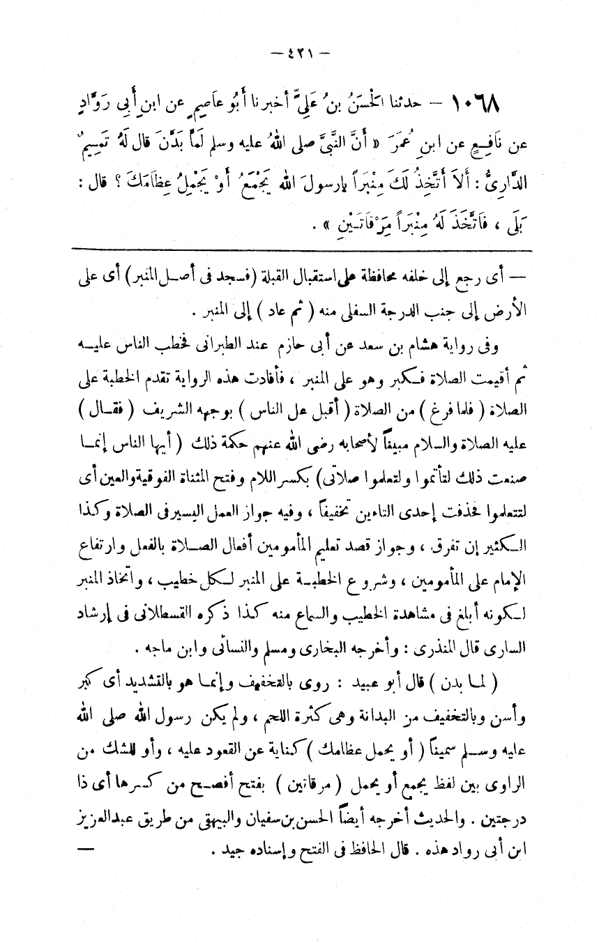 : إِلَى الْمِنْبَرِ . وَفِي رِوَايَة هِشَام بْن سَعْد عَنْ أَبِي جَازِم عِنْد الطَّبَرَانِيّ فَخَطَبَ النَّاس عَلَيْهِ ثُمَّ أُقِيمَتْ الصَّلَاة فَكَبَّرَ وَهُوَ عَلَى الْمِنْبَر ، فَأَفَادَتْ هَذِهِ الرِّوَايَة تَقَدُّم الْخُطْبَة عَلَى الصَّلَاة