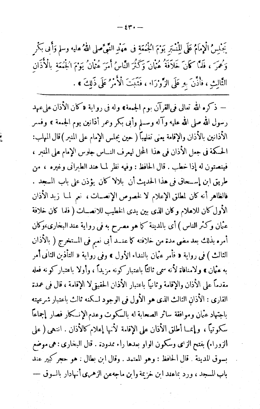 ذَكَرَهُ اللَّه تَعَالَى فِي الْقُرْآن يَوْم الْجُمُعَة " وَلَهُ فِي رِوَايَته " كَانَ الْأَذَان عَلَى عَهْد رَسُول اللَّه وَآله وَسَلَّمَ وَأَبِي بَكْر وَعُمَر أَذَانَيْنِ يَوْم الْجُمُعَة ، وَفَسَّرَ الْأَذَانَيْنِ بِالْأَذَانِ وَالْإِقَامَة يَعْنِي تَغْلِيبًا