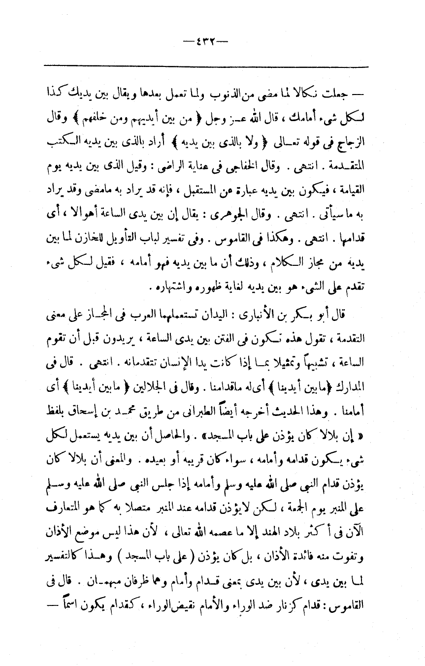 قَالَ أَبُو بَكْر بْن الْأَنْبَارِيّ : الْيَدَانِ تَسْتَعْمِلهُمَا الْعَرَب فِي الْمَجَاز عَلَى مَعْنَى التَّقْدِمَة ، تَقُول هَذِهِ تَكُون فِي الْفِتَن بَيْن يَدَيْ السَّاعَة ، يُرِيدُونَ قَبْل أَنْ تَقُوم السَّاعَة ، تَشْبِيهًا وَتَمْثِيلًا بِمَا إِذَا كَانَتْ يَدَا الْإِنْسَان تَتَقَدَّمَانِهِ . اِنْتَهَى . قَالَ فِي الْمَدَارِك { مَا بَيْن أَيْدِينَا } أَيْ لَهُ مَا قُدَّامنَا . وَقَالَ فِي الْجَلَالَيْنِ { مَا بَيْنَ أَيْدِينَا } أَيْ أَمَامنَا . وَهَذَا الْحَدِيث أَخْرَجَهُ أَيْضًا الطَّبَرَانِيُّ مِنْ طَرِيق مُحَمَّد بْن إِسْحَاق بِلَفْظِ " إِنَّ بِلَالًا كَانَ يُؤَذِّنُ عَلَى بَاب الْمَسْجِد " . وَالْحَاصِل أَنَّ بَيْن يَدَيْهِ يُسْتَعْمَل لِكُلِّ شَيْء يَكُون قُدَّامه وَأَمَامه ، سَوَاء كَانَ قَرِيبه أَوْ بَعِيده . وَالْمَعْنَى أَنَّ بِلَالًا كَانَ يُؤَذِّن قُدَّام النَّبِيّ صَلَّى اللَّه عَلَيْهِ وَسَلَّمَ وَأَمَامه إِذَا جَلَسَ النَّبِيّ صَلَّى اللَّه عَلَيْهِ وَسَلَّمَ عَلَى الْمِنْبَر يَوْم الْجُمُعَة ، لَكِنْ لَا يُؤَذِّن قُدَّامه عِنْد الْمِنْبَر مُتَّصِلًا بِهِ كَمَا هُوَ الْمُتَعَارَف الْآن فِي أَكْثَر بِلَاد الْهِنْد إِلَّا مَا عَصَمَهُ اللَّه تَعَالَى ، لِأَنَّ هَذَا لَيْسَ مَوْضِع الْأَذَان وَتَفُوت مِنْهُ فَائِدَة الْأَذَان ، بَلْ كَانَ يُؤَذِّن