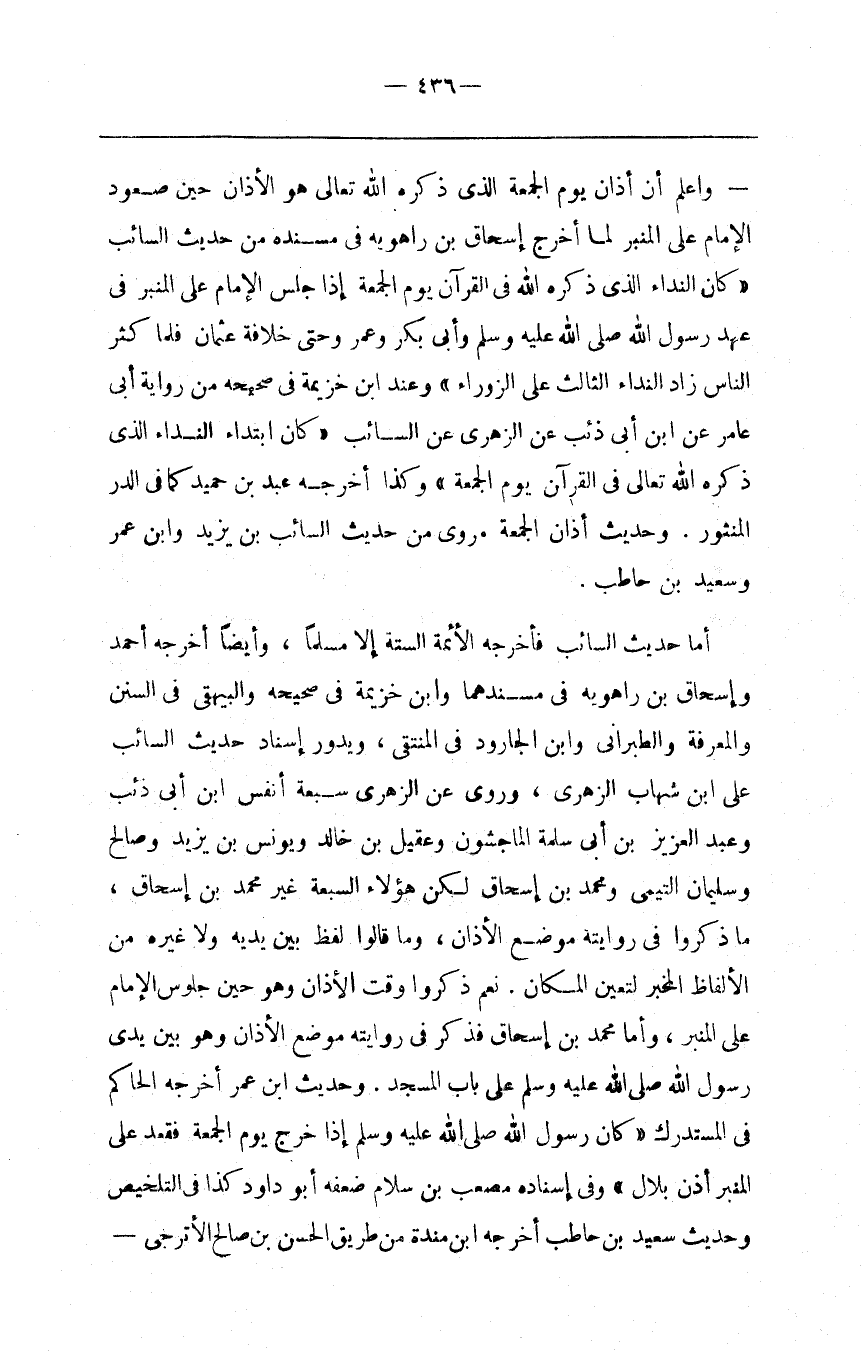 أَمَّا حَدِيث السَّائِب فَأَخْرَجَهُ الْأَئِمَّة السِّتَّة إِلَّا مُسْلِمًا ، وَأَيْضًا أَخْرَجَهُ أَحْمَد وَإِسْحَاق مِنْ رَاهْوَيْهِ فِي مُسْنَدَيْهِمَا وَابْن خُزَيْمَةَ فِي صَحِيحه وَالْبَيْهَقِيُّ فِي السُّنَن وَالْمَعْرِفَة وَالطَّبَرَانِيُّ وَابْن الْجَارُود فِي الْمُنْتَقَى ، وَيَدُور إِسْنَاد حَدِيث السَّائِب عَلَى اِبْن شِهَاب الزُّهْرِيّ ، وَرَوَى عَنْ الزُّهْرِيّ سَبْعَة أَنْفُس اِبْن أَبِي ذِئْب وَعَبْد الْعَزِيز بْن أَبِي سَلَمَة الْمَاجِشُونِ وَعَقِيل بْن خَالِد وَيُونُس بْن يَزِيد وَصَالِح وَسُلَيْمَان التَّيْمِيُّ وَمُحَمَّد بْن إِسْحَاق لَكِنَّ هَؤُلَاءِ السَّبْعَة غَيْر مُحَمَّد بْن إِسْحَاق ، مَا ذَكَرُوا فِي رِوَايَته مَوْضِع الْأَذَان ، وَمَا قَالُوا لَفْظ بَيْن يَدَيْهِ وَلَا غَيْره مِنْ الْأَلْفَاظ الْمُخْبِرَة لِتَعَيُّنِ الْمَكَان . نَعَمْ ذَكَرُوا وَقْت الْأَذَان وَهُوَ حِين جُلُوس الْإِمَام عَلَى الْمِنْبَر ، وَأَمَّا مُحَمَّد بْن إِسْحَاق فَذَكَرَ فِي رِوَايَته مَوْضِع الْأَذَان وَهُوَ بَيْن يَدَيْ رَسُول اللَّه صَلَّى اللَّه عَلَيْهِ وَسَلَّمَ عَلَى بَاب الْمَسْجِد . وَحَدِيث اِبْن عُمَر أَخْرَجَهُ الْحَاكِم فِي الْمُسْتَدْرَك " كَانَ رَسُول اللَّه صَلَّى اللَّه عَلَيْهِ وَسَلَّمَ إِذَا خَرَجَ يَوْم الْجُمُعَة فَقَعَدَ عَلَى الْمِنْبَر أَذَّنَ بِلَال " وَفِي إِسْنَاده مُصْعَب بْن سَلَامٍ ضَعَّفَهُ أَبُو دَاوُدَ كَذَا فِي التَّلْخِيص وَحَدِيث سَعِيد بْن حَاطِب أَخْرَجَهُ اِبْن مَنْدَهْ مِنْ طَرِيق الْحَسَن بْن صَالِح الْأُتْرُجِّيّ@