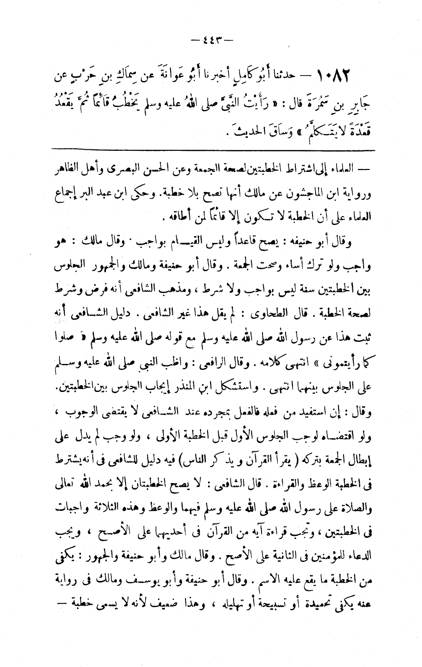 الْعُلَمَاء إِلَى اِشْتِرَاط الْخُطْبَتَيْنِ لِصِحَّةِ الْجُمُعَة وَعَنْ الْحَسَن الْبَصْرِيّ وَأَهْل الظَّاهِر وَرِوَايَة اِبْن الْمَاجِشُونِ عَنْ مَالِك أَنَّهَا تَصِحُّ بِلَا خُطْبَة . وَحَكَى اِبْن عَبْد الْبَرّ إِجْمَاع الْعُلَمَاء عَلَى أَنَّ الْخُطْبَة لَا تَكُون إِلَّا قَائِمًا لِمَنْ أَطَاقَهُ . وَقَالَ أَبُو حَنِيفَة : يَصِحّ قَاعِدًا وَلَيْسَ الْقِيَام بِوَاجِبٍ . وَقَالَ مَالِك : هُوَ وَاجِب وَلَوْ تُرِكَ أَسَاءَ وَصَحَّتْ الْجُمُعَة . وَقَالَ أَبُو حَنِيفَة وَمَالِك وَالْجُمْهُور الْجُلُوس بَيْن الْخُطْبَتَيْنِ سُنَّة لَيْسَ بِوَاجِبٍ وَلَا شَرْط ، وَمَذْهَب الشَّافِعِيّ أَنَّهُ فَرْض وَشَرْط ، وَمَذْهَب الشَّافِعِيّ أَنَّهُ فَرْض وَشَرْط لِصِحَّةِ الْخُطْبَة . قَالَ الطَّحَاوِيُّ : لَمْ يَقُلْ هَذَا غَيْرُ الشَّافِعِيّ . دَلِيل الشَّافِعِيّ أَنَّهُ ثَبَتَ هَذَا عَنْ رَسُول اللَّه صَلَّى اللَّه عَلَيْهِ وَسَلَّمَ مَعَ قَوْله صَلَّى اللَّه عَلَيْهِ وَسَلَّمَ " صَلُّوا كَمَا رَأَيْتُمُونِي " اِنْتَهَى كَلَامه . وَقَالَ الرَّافِعِيّ : وَاظَبَ النَّبِيّ صَلَّى اللَّه عَلَيْهِ وَسَلَّمَ عَلَى الْجُلُوسِ بَيْنهمَا اِنْتَهَى . وَاسْتَشْكَلَ اِبْن الْمُنْذِر إِيجَاب الْجُلُوس بَيْن الْخُطْبَتَيْنِ . وَقَالَ : إِنْ اُسْتُفِيدَ مِنْ فِعْله فَالْفِعْل بِمُجَرَّدِهِ عِنْد الشَّافِعِيّ لَا يَقْتَضِي الْوُجُوب ، وَلَوْ اِقْتَضَاهُ لَوَجَبَ الْجُلُوس الْأَوَّل قَبْل الْخُطْبَة الْأُولَى ، وَلَوْ وَجَبَ لَمْ يَدُلّ عَلَى إِبْطَال الْجُمُعَة بِتَرْكِهِ