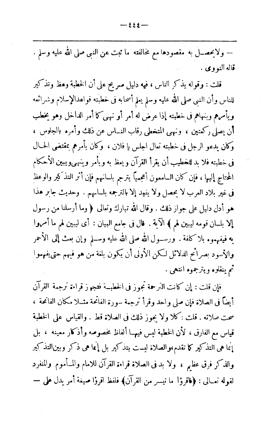 وَلَا يَحْصُل بِهِ مَقْصُودهَا مَعَ مُخَالَفَته مَا ثَبَتَ عَنْ النَّبِيّ صَلَّى اللَّه عَلَيْهِ وَسَلَّمَ . قَالَهُ النَّوَوِيُّ . قُلْت : وَقَوْله يُذَكِّر النَّاس ، فِيهِ دَلِيل صَرِيح عَلَى أَنَّ الْخُطْبَة وَعْظ وَتَذْكِير لِلنَّاسِ وَأَنَّ النَّبِيّ صَلَّى اللَّه عَلَيْهِ وَسَلَّمَ يُعَلِّم أَصْحَابه فِي خُطْبَته قَوَاعِد الْإِسْلَام وَشَرَائِعه وَيَأْمُرهُمْ وَيَنْهَاهُمْ فِي خُطْبَته إِذَا عَرَضَ لَهُ أَمْر أَوْ نَهْي كَمَا أَمَرَ الدَّاخِل وَهُوَ يَخْطُب أَنْ يُصَلِّي رَكْعَتَيْنِ ، وَنَهَى الْمُتَخَطِّي رِقَاب النَّاس عَنْ ذَلِكَ وَأَمَرَهُ بِالْجُلُوسِ ، وَكَانَ يَدْعُو الرَّجُل فِي خُطْبَته تَعَالَ اِجْلِسْ يَا فُلَان ، وَكَانَ يَأْمُرهُمْ بِمُقْتَضَى الْحَال فِي خُطْبَته فَلَا بُدّ لِلْخَطِيبِ أَنْ يَقْرَأ الْقُرْآن وَيَعِظ بِهِ وَيَأْمُر وَيَنْهَى وَيُبَيِّن الْأَحْكَام الْمُحْتَاج إِلَيْهَا ، فَإِنْ كَانَ السَّامِعُونَ أَعَاجِم يُتَرْجِم بِلِسَانِهِمْ فَإِنَّ أَثَر التَّذْكِير وَالْوَعْظ فِي غَيْر بِلَاد الْعَرَب لَا يَحْصُل وَلَا يُفِيد إِلَّا بِالتَّرْجَمَةِ بِلِسَانِهِمْ . وَحَدِيث جَابِر هَذَا هُوَ أَدَلُّ دَلِيلٍ عَلَى جَوَاز ذَلِكَ . وَقَالَ اللَّه تَبَارَكَ وَتَعَالَى { وَمَا أَرْسَلْنَا مِنْ رَسُول إِلَّا بِلِسَانِ قَوْمه لِيُبَيِّنَ لَهُمْ } الْآيَةَ . قَالَ فِي جَامِع الْبَيَان : أَيْ لِيُبَيِّنَ لَهُمْ مَا أُمِرُوا بِهِ فَيَفْهَمُوهُ بِلَا كُلْفَةٍ . وَرَسُول اللَّه صَلَّى اللَّه عَلَيْهِ وَسَلَّمَ وَإِنْ بُعِثَ إِلَى الْأَحْمَر وَالْأَسْوَد بِصَرَائِح الدَّلَائِل لَكِنَّ الْأَوْلَى أَنْ يَكُون بِلُغَةِ مَنْ هُوَ فِيهِمْ حَتَّى يَفْهَمُوا ثُمَّ يَنْقُلُوهُ وَيُتَرْجِمُوهُ اِنْتَهَى . فَإِنْ قُلْت : إِنْ كَانَتْ التَّرْجَمَة تَجُوز فِي الْخُطْبَة فَتَجُوز قِرَاءَة تَرْجَمَة الْقُرْآن أَيْضًا فِي الصَّلَاة فَإِنْ صَلَّى وَاحِد وَقَرَأَ تَرْجَمَة سُورَة الْفَاتِحَة مَثَلًا مَكَان الْفَاتِحَة ، صَحَّتْ صَلَاتُهُ . قُلْت : كَلَّا وَلَا يَجُوز ذَلِكَ فِي الصَّلَاة قَطُّ . وَالْقِيَاس عَلَى الْخُطْبَة قِيَاسٌ مَعَ الْفَارِق ، لِأَنَّ الْخُطْبَة لَيْسَ فِيهَا أَلْفَاظ مَخْصُوصَة وَأَذْكَار مُعَيَّنَة ، بَلْ إِنَّمَا هِيَ التَّذْكِير كَمَا تَقَدَّمَ ، وَالصَّلَاة لَيْسَتْ بِتَذْكِيرٍ بَلْ إِنَّمَا هِيَ ذِكْر وَبَيْن التَّذْكِير وَالذِّكْر فَرْق عَظِيم ، وَلَا بُدّ فِي الصَّلَاة قِرَاءَة الْقُرْآن لِلْإِمَامِ وَالْمَأْمُوم وَالْمُنْفَرِد لِقَوْلِهِ تَعَالَى : { فَاقْرَءُوا مَا تَيَسَّرَ مِنْ الْقُرْآن } فَلَفْظ اِقْرَءُوا صِيغَة أَمْر يَدُلّ عَلَى@