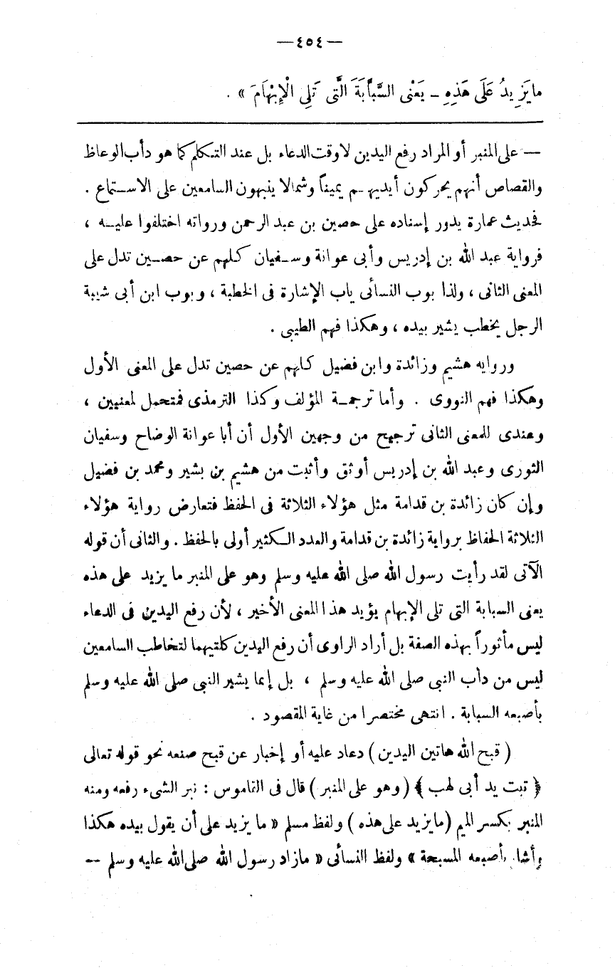 عَلَى الْمِنْبَر أَوْ الْمُرَاد رَفْع الْيَدَيْنِ لَا وَقْت الدُّعَاء بَلْ عِنْد التَّكَلُّم كَمَا هُوَ دَأْب الْوُعَّاظ وَالْقُصَّاص أَنَّهُمْ يُحَرِّكُونَ أَيْدِيهمْ يَمِينًا وَشِمَالًا يُنَبِّهُونَ السَّامِعِينَ عَلَى الِاسْتِمَاع . فَحَدِيث عُمَارَة يَدُور إِسْنَاده عَلَى حُصَيْن بْن عَبْد الرَّحْمَن وَرُوَاته اِخْتَلَفُوا عَلَيْهِ ، فَرِوَايَة عَبْد اللَّه بْن إِدْرِيس وَأَبِي عَوَانَة وَسُفْيَان كُلّهمْ عَنْ حُصَيْنٍ تَدُلّ عَلَى الْمَعْنَى الثَّانِي ، وَلِذَا بَوَّبَ النَّسَائِيُّ بَاب الْإِشَارَة فِي الْخُطْبَة ، وَبَوَّبَ اِبْن أَبِي شَيْبَة الرَّجُل يَخْطُب يُشِير بِيَدِهِ ، وَهَكَذَا فَهِمَ الطِّيبِيُّ . وَرِوَايَة هُشَيْم وَزَائِدَة وَابْن فُضَيْلٍ كُلّهمْ عَنْ حُصَيْنٍ تَدُلّ عَلَى الْمَعْنَى الْأَوَّل وَهَكَذَا فَهِمَ النَّوَوِيّ وَأَمَّا تَرْجَمَة الْمُؤَلِّف وَكَذَا التِّرْمِذِيّ فَمُتَحَمِّل لِمَعْنَيَيْنِ ، وَعِنْدِي لِلْمَعْنَى الثَّانِي تَرْجِيح مِنْ وَجْهَيْنِ الْأَوَّل أَنَّ أَبَا عَوَانَة الْوَضَّاح وَسُفْيَان الثَّوْرِيّ وَعَبْد اللَّه بْن إِدْرِيس أَوْثَق وَأَثْبَت مِنْ هُشَيْم بْن بَشِير وَمُحَمَّد بْن فُضَيْلٍ وَإِنْ كَانَ زَائِدَة بْن قُدَامَةَ مِثْل هَؤُلَاءِ الثَّلَاثَة فِي الْحِفْظ فَتُعَارَضُ رِوَايَة هَؤُلَاءِ الثَّلَاثَة الْحُفَّاظ بِرِوَايَةِ زَائِدَة بْن قُدَامَةَ وَالْعَدَد الْكَثِير أَوْلَى بِالْحِفْظِ . وَالثَّانِي أَنَّ قَوْله الْآتِي لَقَدْ رَأَيْت رَسُول اللَّه صَلَّى اللَّه عَلَيْهِ وَسَلَّمَ وَهُوَ عَلَى الْمِنْبَر مَا يَزِيد عَلَى هَذِهِ يَعْنِي السَّبَّابَة الَّتِي تَلِي الْإِبْهَام يُؤَيِّد هَذَا الْمَعْنَى الْأَخِير ، لِأَنَّ رَفْع الْيَدَيْنِ فِي الدُّعَاء لَيْسَ مَأْثُورًا بِهَذِهِ الصِّفَة بَلْ أَرَادَ الرَّاوِي أَنَّ رَفْع الْيَدَيْنِ كِلْتَيْهِمَا لِتَخَاطُبِ السَّامِعِينَ لَيْسَ مِنْ دَأْب النَّبِيّ صَلَّى اللَّه عَلَيْهِ وَسَلَّمَ ، بَلْ إِنَّمَا يُشِير النَّبِيّ صَلَّى اللَّه عَلَيْهِ وَسَلَّمَ بِأُصْبُعِهِ السَّبَّابَة . اِنْتَهَى مُخْتَصَرًا مِنْ غَايَةِ الْمَقْصُودِ .