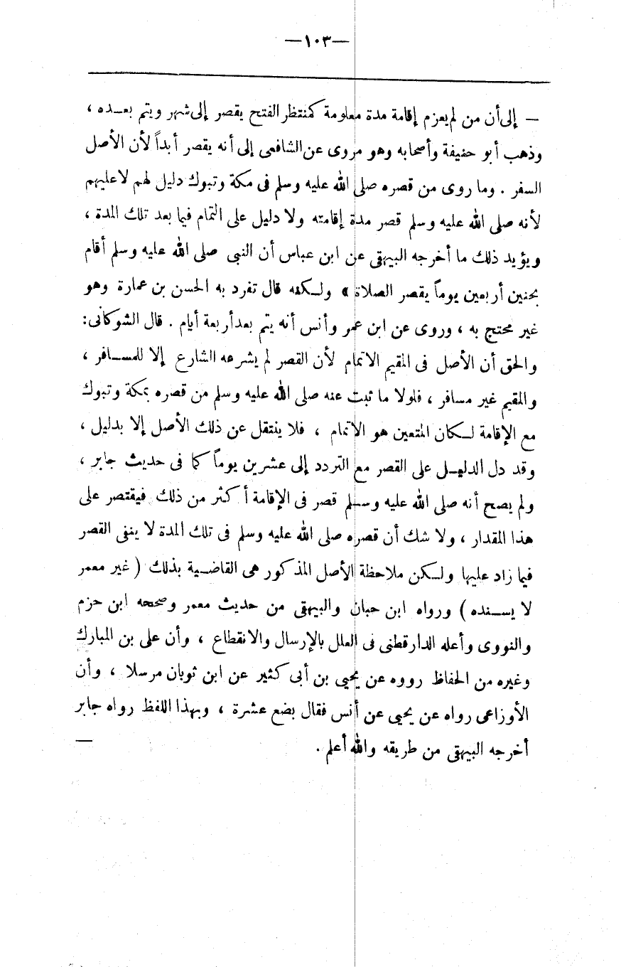 إِلَى أَنَّ مَنْ لَمْ يَعْزِم إِقَامَة مُدَّة مَعْلُومَة كَمُنْتَظِرِ الْفَتْح يَقْصُر إِلَى شَهْر وَيُتِمّ بَعْده ، وَذَهَبَ أَبُو حَنِيفَة وَأَصْحَابه وَهُوَ مَرْوِيّ عَنْ الشَّافِعِيّ إِلَى أَنَّهُ يَقْصُر أَبَدًا لِأَنَّ الْأَصْل السَّفَر . وَمَا رُوِيَ مِنْ قَصْره صَلَّى اللَّه عَلَيْهِ وَسَلَّمَ فِي مَكَّة وَتَبُوك دَلِيل لَهُمْ لَا عَلَيْهِمْ لِأَنَّهُ صَلَّى اللَّه عَلَيْهِ وَسَلَّمَ قَصَرَ مُدَّة إِقَامَته وَلَا دَلِيل عَلَى التَّمَام فِيمَا بَعْد تِلْكَ الْمُدَّة ، وَيُؤَيِّد ذَلِكَ مَا أَخْرَجَهُ الْبَيْهَقِيُّ عَنْ اِبْن عَبَّاس أَنَّ النَّبِيّ صَلَّى اللَّه عَلَيْهِ وَسَلَّمَ أَقَامَ بِحُنَيْنٍ أَرْبَعِينَ يَوْمًا يَقْصُر الصَّلَاة وَلَكِنَّهُ قَالَ تَفَرَّدَ بِهِ الْحَسَن بْن عُمَارَة وَهُوَ غَيْر مُحْتَجّ بِهِ ، وَرُوِيَ عَنْ اِبْن عُمَر وَأَنَس أَنَّهُ يُتِمّ بَعْد أَرْبَعَة أَيَّام . قَالَ الشَّوْكَانِيُّ : وَالْحَقّ أَنَّ الْأَصْل فِي الْمُقِيم الْإِتْمَام لِأَنَّ الْقَصْر لَمْ يَشْرَعهُ الشَّارِع إِلَّا لِلْمُسَافِرِ ، وَالْمُقِيم غَيْر مُسَافِر ، فَلَوْلَا مَا ثَبَتَ عَنْهُ صَلَّى اللَّه عَلَيْهِ وَسَلَّمَ مِنْ قَصْره بِمَكَّة وَتَبُوك مَعَ الْإِقَامَة لَكَانَ الْمُتَعَيَّن هُوَ الْإِتْمَام ، فَلَا يَنْتَقِل عَنْ ذَلِكَ الْأَصْل إِلَّا بِدَلِيلٍ ، وَقَدْ دَلَّ الدَّلِيل عَلَى الْقَصْر مَعَ التَّرَدُّد إِلَى عِشْرِينَ يَوْمًا كَمَا فِي حَدِيث جَابِر ، وَلَمْ يَصِحّ أَنَّهُ صَلَّى اللَّه عَلَيْهِ وَسَلَّمَ قَصَرَ فِي الْإِقَامَة أَكْثَر مِنْ ذَلِكَ فَيَقْتَصِر عَلَى هَذَا الْمِقْدَار ، وَلَا شَكّ أَنَّ قَصْره صَلَّى اللَّه عَلَيْهِ وَسَلَّمَ فِي تِلْكَ الْمُدَّة لَا يَنْفِي الْقَصْر فِيمَا زَادَ عَلَيْهَا وَلَكِنْ مُلَاحَظَة الْأَصْل الْمَذْكُورَة هِيَ الْقَاضِيَة بِذَلِكَ