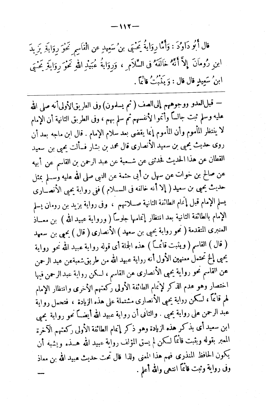 : هَذِهِ الْجُمْلَة أَيْ قَوْله رِوَايَة عُبَيْد اللَّه نَحْو رِوَايَة يَحْيَى إِلَخْ تَحْتَمِل مَعْنَيَيْنِ : الْأَوَّل أَنَّهُ رِوَايَة عُبَيْد اللَّه مِنْ طَرِيق شُعْبَة عَنْ عَبْد الرَّحْمَن عَنْ الْقَاسِم نَحْو رِوَايَة يَحْيَى الْأَنْصَارِيّ عَنْ الْقَاسِم ، لَكِنْ رِوَايَة عَبْد الرَّحْمَن فِيهَا اِخْتِصَار وَهُوَ عَدَم الذِّكْر لِإِتْمَامِ الطَّائِفَة الْأُولَى رَكْعَتهمْ الْأُخْرَى وَانْتِظَار الْإِمَام لَهُمْ قَائِمًا ، لَكِنْ رِوَايَة يَحْيَى الْأَنْصَارِيّ مُشْتَمِلَة عَلَى هَذِهِ الزِّيَادَة ، فَتُحْمَل رِوَايَة عَبْد الرَّحْمَن عَلَى رِوَايَة يَحْيَى . وَالثَّانِي أَنَّ رِوَايَة عُبَيْد اللَّه أَيْضًا نَحْو رِوَايَة يَحْيَى بْن سَعِيد أَيْ بِذِكْرِ هَذِهِ الزِّيَادَة وَهُوَ ذِكْر إِتْمَام الطَّائِفَة الْأُولَى رَكْعَتهمْ الْآخِرَة الْمُعَبَّر بِقَوْلِهِ وَيَثْبُت قَائِمًا لَكِنْ لَمْ يَسُقْ الْمُؤَلِّف رِوَايَة عُبَيْد اللَّه هَذِهِ وَيُشْبِه أَنْ يَكُون الْحَافِظ الْمُنْذِرِيُّ فَهِمَ هَذَا الْمَعْنَى وَلِذَا قَالَ تَحْت حَدِيث عُبَيْد اللَّه بْن مُعَاذ وَفِي رِوَايَة وَثَبَتَ قَائِمًا اِنْتَهَى وَاَللَّه أَعْلَم .@