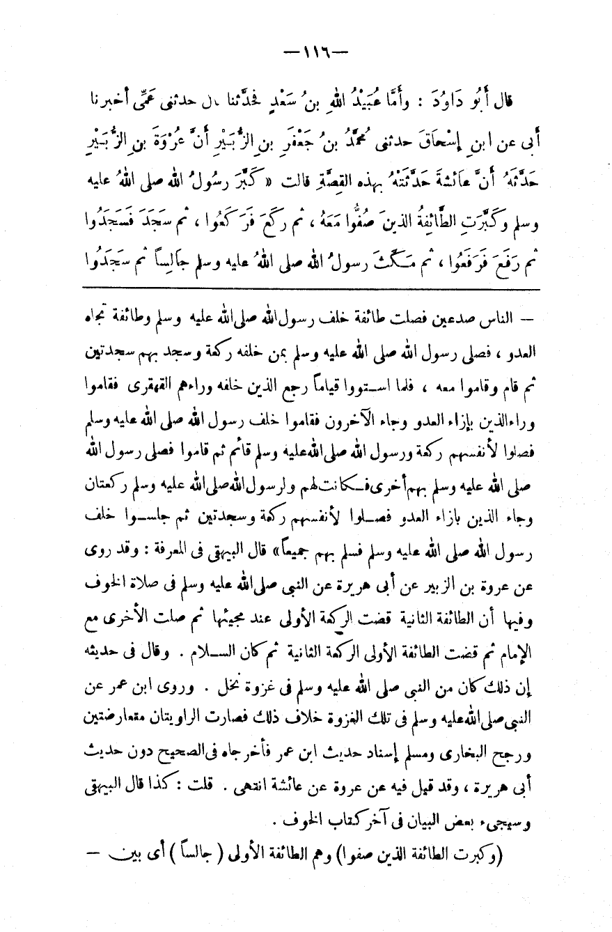النَّاس صَدْعَيْنِ فَصَلَّتْ طَائِفَة خَلْف رَسُول اللَّه صَلَّى اللَّه عَلَيْهِ وَسَلَّمَ وَطَائِفَة تُجَاه الْعَدُوّ ، فَصَلَّى رَسُول اللَّه صَلَّى اللَّه عَلَيْهِ وَسَلَّمَ بِمَنْ خَلْفه رَكْعَة وَسَجَدَ بِهِمْ سَجْدَتَيْنِ ثُمَّ قَامَ وَقَامُوا مَعَهُ ، فَلَمَّا اِسْتَوَوْا قِيَامًا رَجَعَ الَّذِينَ خَلْفه وَرَاءَهُمْ الْقَهْقَرَى فَقَامُوا وَرَاء الَّذِينَ بِإِزَاءِ الْعَدُوّ وَجَاءَ الْآخَرُونَ فَقَامُوا خَلْف رَسُول اللَّه صَلَّى اللَّه عَلَيْهِ وَسَلَّمَ فَصَلَّوْا لِأَنْفُسِهِمْ رَكْعَة وَرَسُول اللَّه صَلَّى اللَّه عَلَيْهِ وَسَلَّمَ قَائِم ثُمَّ قَامُوا فَصَلَّى رَسُول اللَّه صَلَّى اللَّه عَلَيْهِ وَسَلَّمَ بِهِمْ أُخْرَى فَكَانَتْ لَهُمْ وَلِرَسُولِ اللَّه صَلَّى اللَّه عَلَيْهِ وَسَلَّمَ رَكْعَتَانِ وَجَاءَ الَّذِينَ بِإِزَاءِ الْعَدُوّ فَصَلَّوْا لِأَنْفُسِهِمْ رَكْعَة وَسَجْدَتَيْنِ ثُمَّ جَلَسُوا خَلْف رَسُول اللَّه صَلَّى اللَّه عَلَيْهِ وَسَلَّمَ فَسَلَّمَ بِهِمْ جَمِيعًا " قَالَ الْبَيْهَقِيّ فِي الْمَعْرِفَة : وَقَدْ رُوِيَ عَنْ عُرْوَة بْن الزُّبَيْر عَنْ أَبِي هُرَيْرَة عَنْ النَّبِيّ صَلَّى اللَّه عَلَيْهِ وَسَلَّمَ فِي صَلَاة الْخَوْف وَفِيهَا أَنَّ الطَّائِفَة الثَّانِيَة قَضَتْ الرَّكْعَة الْأُولَى عِنْد مَجِيئِهَا ثُمَّ صُلِمَتْ الْأُخْرَى مَعَ الْإِمَام ثُمَّ قَضَتْ الطَّائِفَة الْأُولَى الرَّكْعَة الثَّانِيَة ثُمَّ كَانَ السَّلَام . وَقَالَ فِي حَدِيثه إِنَّ ذَلِكَ كَانَ مِنْ النَّبِيّ صَلَّى اللَّه عَلَيْهِ وَسَلَّمَ فِي غَزْوَة نَخْل . وَرَوَى اِبْن عُمَر عَنْ النَّبِيّ صَلَّى اللَّه عَلَيْهِ وَسَلَّمَ فِي تِلْكَ الْغَزْوَة خِلَاف ذَلِكَ فَصَارَتْ الرِّوَايَتَانِ مُتَعَارِضَتَيْنِ وَرَجَّحَ الْبُخَارِيّ وَمُسْلِم إِسْنَاد حَدِيث اِبْن عُمَر فَأَخْرَجَاهُ فِي الصَّحِيح دُون حَدِيث أَبِي هُرَيْرَة ، وَقَدْ قِيلَ فِيهِ عَنْ عُرْوَة عَنْ عَائِشَة اِنْتَهَى . قُلْت : كَذَا قَالَ الْبَيْهَقِيُّ وَسَيَجِيءُ بَعْض الْبَيَان فِي آخِر كِتَاب الْخَوْف .