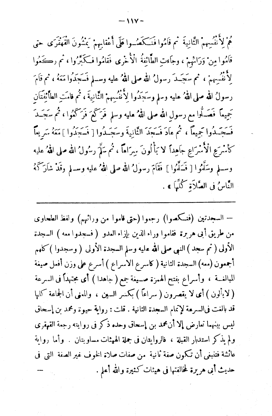 : بِكَسْرِ السِّين ، وَالْمَعْنَى أَنَّ الْجَمَاعَة كُلّهَا قَدْ بَالَغَتْ فِي السُّرْعَة لِإِتْمَامِ السَّجْدَة الثَّانِيَة . قُلْت : رِوَايَة حَيْوَة وَمُحَمَّد بْن إِسْحَاق لَيْسَ بَيْنهمَا تَعَارُض إِلَّا أَنَّ مُحَمَّد بْن إِسْحَاق وَحْده ذَكَرَ فِي رِوَايَته رَجْعَة الْقَهْقَرَى وَلَمْ يَذْكُر اِسْتِدْبَار الْقِبْلَة ، فَالرِّوَايَتَانِ فِي جُمْلَة الْهَيْئَات مُسَاوِيَتَانِ . وَأَمَّا رِوَايَة عَائِشَة فَتَنْبَغِي أَنْ تَكُون صِفَة ثَانِيَة مِنْ صِفَات صَلَاة الْخَوْف غَيْر الصِّفَة الَّتِي فِي حَدِيث أَبِي هُرَيْرَة لِمُخَالَفَتِهَا فِي هَيْئَات كَثِيرَة وَاَللَّه أَعْلَم .@