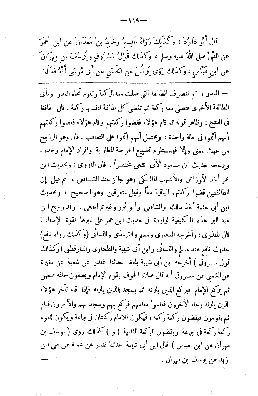 الْعَدُوّ ، ثُمَّ تَنْصَرِف الطَّائِفَة الَّتِي صَلَّتْ مَعَهُ الرَّكْعَة وَتَقُوم تُجَاه الْعَدُوّ وَتَأْتِي الطَّائِفَة الْأُخْرَى فَتُصَلِّي مَعَهُ رَكْعَة ثُمَّ تَقْضِي كُلّ طَائِفَة لِنَفْسِهَا رَكْعَة قَالَ الْحَافِظ فِي الْفَتْح : وَظَاهِر قَوْله ثُمَّ قَامَ هَؤُلَاءِ فَقَضَوْا رَكْعَتهمْ وَقَامَ هَؤُلَاءِ فَقَضَوْا رَكْعَتهمْ أَنَّهُمْ أَتَمُّوا فِي حَالَة وَاحِدَة ، وَيَحْتَمِل أَنَّهُمْ أَتَمُّوا عَلَى التَّعَاقُب . قَالَ وَهُوَ الرَّاجِح مِنْ حَيْثُ الْمَعْنَى وَإِلَّا فَيَسْتَلْزِم تَضْيِيع الْحِرَاسَة الْمَطْلُوبَة وَإِفْرَاد الْإِمَام وَحْده ، وَيُرَجِّحهُ حَدِيث اِبْن مَسْعُود الْآتِي اِنْتَهَى مُخْتَصَرًا . قَالَ النَّوَوِيّ : وَبِحَدِيثِ اِبْن عُمَر أَخَذَ الْأَوْزَاعِيُّ وَالْأَشْهَب الْمَالِكِيّ وَهُوَ جَائِز عِنْد الشَّافِعِيّ ، ثُمَّ قِيلَ إِنَّ الطَّائِفَتَيْنِ قَضَوْا رَكْعَتهمْ الْبَاقِيَة مَعًا وَقِيلَ مُنْفَرِقِينَ وَهُوَ الصَّحِيح ، وَبِحَدِيثِ اِبْن أَبِي حَثْمَة أَخَذَ مَالِك وَالشَّافِعِيّ وَأَبُو ثَوْر وَغَيْرهمْ اِنْتَهَى وَقَدْ رَجَّحَ اِبْن عَبْد الْبَرّ هَذِهِ الْكَيْفِيَّة الْوَارِدَة فِي حَدِيث اِبْن عُمَر عَلَى غَيْرهَا لِقُوَّةِ الْإِسْنَاد قَالَ الْمُنْذِرِيُّ : وَأَخْرَجَهُ الْبُخَارِيّ وَمُسْلِم وَالتِّرْمِذِيّ وَالنَّسَائِيّ