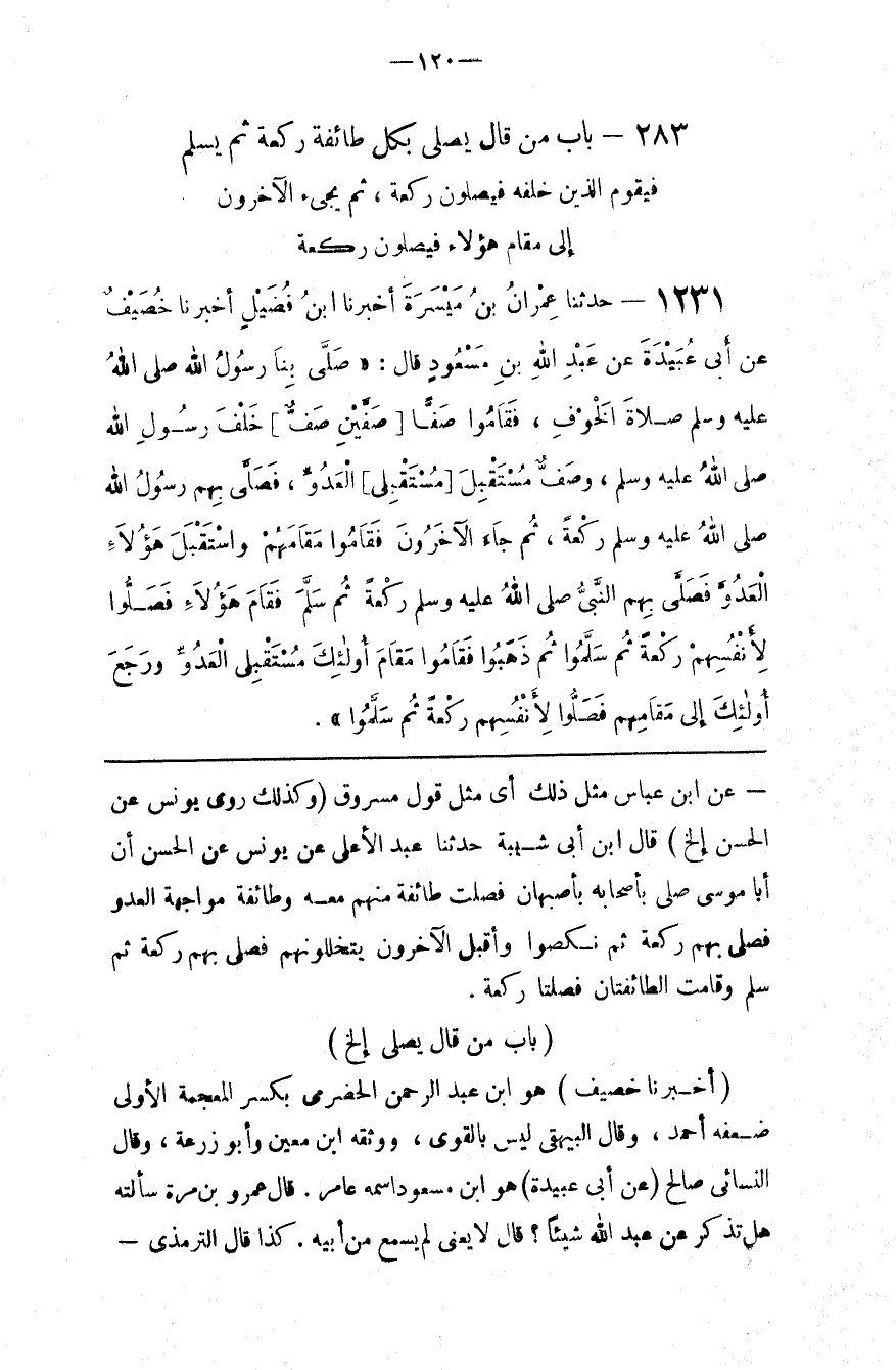 إِلَخْ : قَالَ اِبْن أَبِي شَيْبَة حَدَّثَنَا عَبْد الْأَعْلَى عَنْ يُونُس عَنْ الْحَسَن أَنَّ أَبَا مُوسَى صَلَّى بِأَصْحَابِهِ بِأَصْبَهَانَ فَصَلَّتْ طَائِفَة مِنْهُمْ مَعَهُ وَطَائِفَة مُوَاجِهَة الْعَدُوّ فَصَلَّى بِهِمْ رَكْعَة ثُمَّ نَكَصُوا وَأَقْبَلَ الْآخَرُونَ يَتَخَلَّلُونَهُمْ فَصَلَّى بِهِمْ رَكْعَة ثُمَّ سَلَّمَ وَقَامَتْ الطَّائِفَتَانِ فَصَلَّتَا رَكْعَة .
