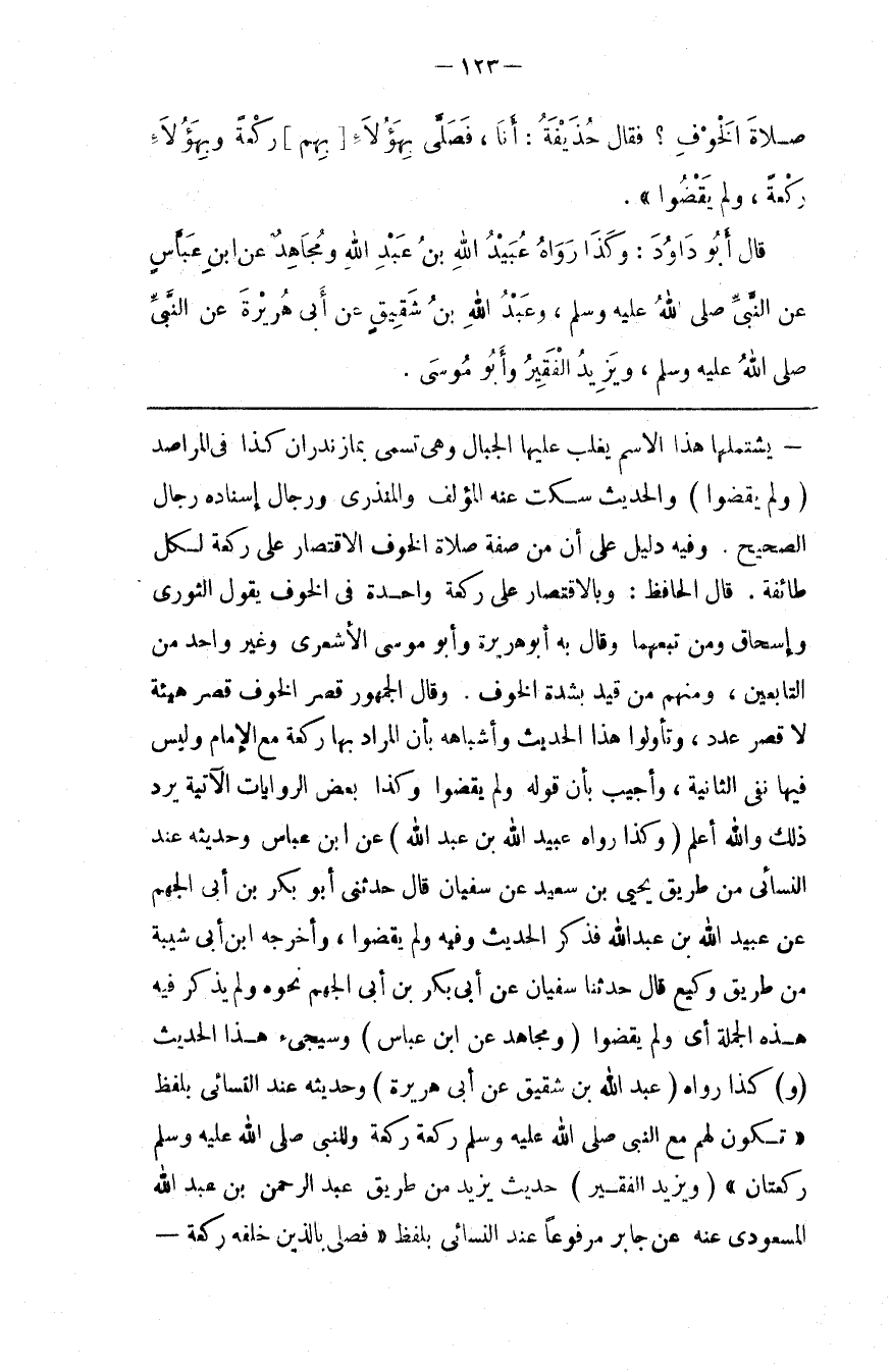 : وَالْحَدِيث سَكَتَ عَنْهُ الْمُؤَلِّف وَالْمُنْذِرِيّ وَرِجَال إِسْنَاده رِجَال الصَّحِيح . وَفِيهِ دَلِيل عَلَى أَنَّ مِنْ صِفَة صَلَاة الْخَوْف الِاقْتِصَار عَلَى رَكْعَة لِكُلِّ طَائِفَة . قَالَ الْحَافِظ : وَبِالِاقْتِصَارِ عَلَى رَكْعَة وَاحِدَة فِي الْخَوْف يَقُول الثَّوْرِيّ وَإِسْحَاق وَمَنْ تَبِعَهُمَا وَقَالَ بِهِ أَبُو هُرَيْرَة وَأَبُو مُوسَى الْأَشْعَرِيّ وَغَيْر وَاحِد مِنْ التَّابِعِينَ ، وَمِنْهُمْ مَنْ قَيَّدَ بِشِدَّةِ الْخَوْف . وَقَالَ الْجُمْهُور قَصْر الْخَوْف قَصْر هَيْئَة لَا قَصْر عَدَد ، وَتَأَوَّلُوا هَذَا الْحَدِيث وَأَشْبَاهه بِأَنَّ الْمُرَاد بِهَا رَكْعَة مَعَ الْإِمَام وَلَيْسَ فِيهَا نَفْي الثَّانِيَة ، وَأُجِيبَ بِأَنَّ قَوْله وَلَمْ يَقْضُوا وَكَذَا بَعْض الرِّوَايَات الْآتِيَة يَرُدُّ ذَلِكَ وَاَللَّه أَعْلَم