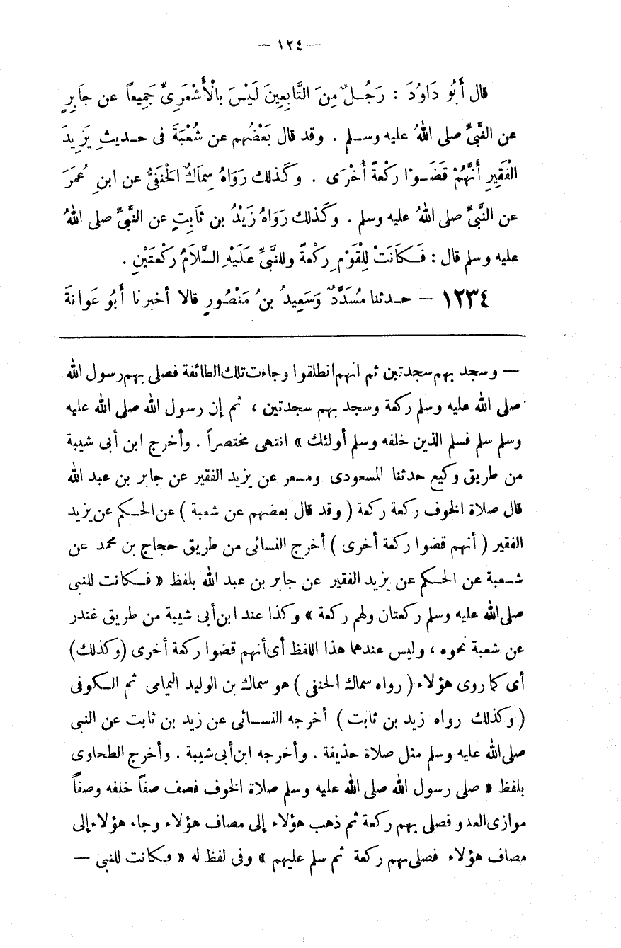 وَسَجَدَ بِهِمْ سَجْدَتَيْنِ ثُمَّ إِنَّهُمْ اِنْطَلَقُوا وَجَاءَتْ تِلْكَ الطَّائِفَة فَصَلَّى بِهِمْ رَسُول اللَّه صَلَّى اللَّه عَلَيْهِ وَسَلَّمَ رَكْعَة وَسَجَدَ بِهِمْ سَجْدَتَيْنِ ، ثُمَّ إِنَّ رَسُول اللَّه صَلَّى اللَّه عَلَيْهِ وَسَلَّمَ سَلَّمَ فَسَلَّمَ الَّذِينَ خَلْفه وَسَلَّمَ أُولَئِكَ " اِنْتَهَى مُخْتَصَرًا . وَأَخْرَجَ اِبْن أَبِي شَيْبَة مِنْ طَرِيق وَكِيع حَدَّثَنَا الْمَسْعُودِيّ وَمِسْعَر عَنْ يَزِيد الْفَقِير عَنْ جَابِر بْن عَبْد اللَّه قَالَ صَلَاة الْخَوْف رَكْعَة رَكْعَة