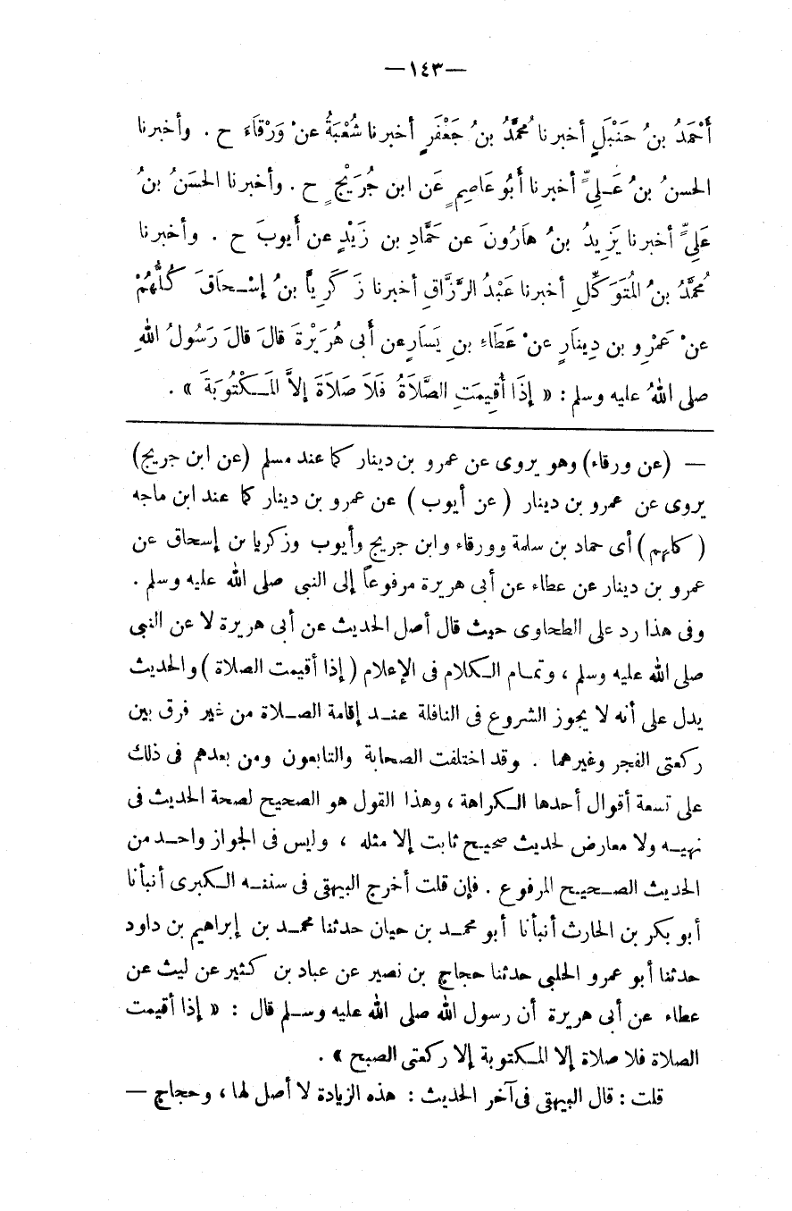 : وَالْحَدِيث يَدُلّ عَلَى أَنَّهُ لَا يَجُوز الشُّرُوع فِي النَّافِلَة عِنْد إِقَامَة الصَّلَاة مِنْ غَيْر فَرْق بَيْن رَكْعَتَيْ الْفَجْر وَغَيْرهمَا . وَقَدْ اِخْتَلَفَتْ الصَّحَابَة وَالتَّابِعُونَ وَمَنْ بَعْدهمْ فِي ذَلِكَ عَلَى تِسْعَة أَقْوَال أَحَدهَا الْكَرَاهَة ، وَهَذَا الْقَوْل هُوَ الصَّحِيح لِصِحَّةِ الْحَدِيث فِي نَهْيه وَلَا مُعَارِض لِحَدِيثٍ صَحِيحٍ ثَابِتٍ إِلَّا مِثْله ، وَلَيْسَ فِي الْجَوَاز وَاحِد مِنْ الْحَدِيث الصَّحِيح الْمَرْفُوع . فَإِنْ قُلْت أَخْرَجَ الْبَيْهَقِيُّ فِي سُنَنه الْكُبْرَى أَنْبَأَنَا أَبُو بَكْر بْن الْحَارِث أَنْبَأَنَا أَبُو مُحَمَّد بْن حَيَّان حَدَّثَنَا مُحَمَّد اِبْن إِبْرَاهِيم بْن دَاوُدَ حَدَّثَنَا أَبُو عَمْرو الْحَلَبِيّ حَدَّثَنَا حَجَّاج بْن نُصَيْر عَنْ عَبَّاد بْن كَثِير عَنْ لَيْث عَنْ عَطَاء عَنْ أَبِي هُرَيْرَة أَنَّ رَسُول اللَّه صَلَّى اللَّه عَلَيْهِ وَسَلَّمَ قَالَ : " إِذَا أُقِيمَتْ الصَّلَاة فَلَا صَلَاة إِلَّا الْمَكْتُوبَة إِلَّا رَكْعَتَيْ الصُّبْح " . قُلْت : قَالَ الْبَيْهَقِيُّ فِي آخِر الْحَدِيث : هَذِهِ الزِّيَادَة لَا أَصْل لَهَا ، وَحَجَّاج @