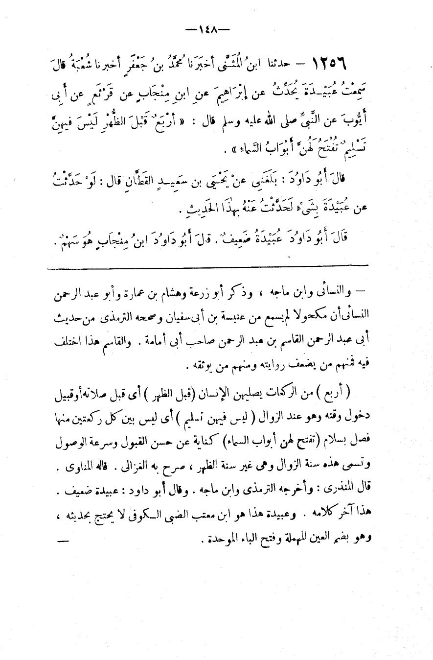 قَالَ الْمُنْذِرِيُّ : وَأَخْرَجَهُ التِّرْمِذِيّ وَابْن مَاجَهْ . وَقَالَ أَبُو دَاوُد : عُبَيْدَة ضَعِيف . هَذَا آخِر كَلَامه . وَعُبَيْدَة هَذَا هُوَ اِبْن مُعَتِّب الضَّبِّيُّ الْكُوفِيّ لَا يُحْتَجّ بِحَدِيثِهِ ، وَهُوَ بِضَمِّ الْعَيْن الْمُهْمَلَة وَفَتْح الْبَاء الْمُوَحَّدَة .@