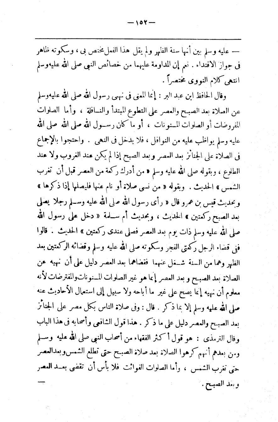 عَلَيْهِ وَسَلَّمَ بَيَّنَ أَنَّهَا سُنَّة الظُّهْر وَلَمْ يَقُلْ هَذَا الْفِعْل مُخْتَصّ بِي ، وَسُكُوته ظَاهِر فِي جَوَاز الِاقْتِدَاء . نَعَمْ إِنَّ الْمُدَاوَمَة عَلَيْهِمَا مِنْ خَصَائِص النَّبِيّ صَلَّى اللَّه عَلَيْهِ وَسَلَّمَ اِنْتَهَى كَلَام النَّوَوِيّ مُخْتَصَرًا . وَقَالَ الْحَافِظ اِبْن عَبْد الْبَرّ : إِنَّمَا الْمَعْنَى فِي نَهْي رَسُول اللَّه صَلَّى اللَّه عَلَيْهِ وَسَلَّمَ عَنْ الصَّلَاة بَعْد الصُّبْح وَالْعَصْر عَلَى التَّطَوُّع الْمُبْتَدَأ وَالنَّافِلَة ، وَأَمَّا الصَّلَوَات الْمَفْرُوضَات أَوْ الصَّلَوَات الْمَسْنُونَات ، أَوْ مَا كَانَ رَسُول اللَّه صَلَّى اللَّه عَلَيْهِ وَسَلَّمَ يُوَاظِب عَلَيْهِ مِنْ النَّوَافِل ، فَلَا يَدْخُل فِي النَّهْي . وَاحْتَجُّوا بِالْإِجْمَاعِ فِي الصَّلَاة عَلَى الْجَنَائِز بَعْد الْعَصْر وَبَعْد الصُّبْح إِذَا لَمْ يَكُنْ عِنْد الْغُرُوب وَلَا عِنْد الطُّلُوع ، وَبِقَوْلِهِ صَلَّى اللَّه عَلَيْهِ وَسَلَّمَ : " مَنْ أَدْرَكَ رَكْعَة مِنْ الْعَصْر قَبْل أَنْ تَغْرُب الشَّمْس " الْحَدِيث . وَبِقَوْلِهِ : " مَنْ نَسِيَ صَلَاة أَوْ نَامَ عَنْهَا فَلْيُصَلِّهَا إِذَا ذَكَرَهَا " وَبِحَدِيثِ قَيْس بْن عَمْرو قَالَ : " رَأَى رَسُول اللَّه صَلَّى اللَّه عَلَيْهِ وَسَلَّمَ رَجُلًا يُصَلِّي بَعْد الصُّبْح رَكْعَتَيْنِ " الْحَدِيث ، وَبِحَدِيثِ أُمّ سَلَمَة : " دَخَلَ عَلَيَّ رَسُول اللَّه صَلَّى اللَّه عَلَيْهِ وَسَلَّمَ ذَات يَوْم بَعْد الْعَصْر فَصَلَّى عِنْدِي رَكْعَتَيْنِ " الْحَدِيث . قَالُوا فَفِي قَضَاء الرَّجُل رَكْعَتَيْ الْفَجْر وَسُكُوته صَلَّى اللَّه عَلَيْهِ وَسَلَّمَ وَقَضَائِهِ الرَّكْعَتَيْنِ بَعْد الظُّهْر وَهُمَا مِنْ السُّنَّة شُغِلَ عَنْهُمَا فَقَضَاهُمَا بَعْد الْعَصْر دَلِيل عَلَى أَنَّ نَهْيه عَنْ الصَّلَاة بَعْد الصُّبْح وَبَعْد الْعَصْر إِنَّمَا هُوَ غَيْر الصَّلَوَات الْمَسْنُونَات وَالْمُفْتَرَضَات لِأَنَّهُ مَعْلُوم أَنَّ نَهْيه إِنَّمَا أَصْبَحَ عَلَى غَيْر مَا أَبَاحَهُ وَلَا سَبِيل إِلَى اِسْتِعْمَال الْأَحَادِيث عَنْهُ صَلَّى اللَّه عَلَيْهِ وَسَلَّمَ إِلَّا بِمَا ذَكَرَ . قَالَ : وَفِي صَلَاة النَّاس بِكُلِّ مِصْر عَلَى الْجَنَائِز بَعْد الصُّبْح وَالْعَصْر دَلِيل عَلَى مَا ذَكَرَ . هَذَا قَوْل الشَّافِعِيّ وَأَصْحَابه فِي هَذَا الْبَاب وَقَالَ التِّرْمِذِيّ : هُوَ قَوْل أَكْثَر الْفُقَهَاء مِنْ أَصْحَاب النَّبِيّ صَلَّى اللَّه عَلَيْهِ وَسَلَّمَ وَمَنْ بَعْدهمْ أَنَّهُمْ كَرِهُوا الصَّلَاة بَعْد صَلَاة الصُّبْح حَتَّى تَطْلُع الشَّمْس وَبَعْد الْعَصْر حَتَّى تَغْرُب الشَّمْس ، وَأَمَّا الصَّلَوَات الْفَوَائِت فَلَا بَأْس أَنْ تُقْضَى بَعْد الْعَصْر وَبَعْد الصُّبْح @