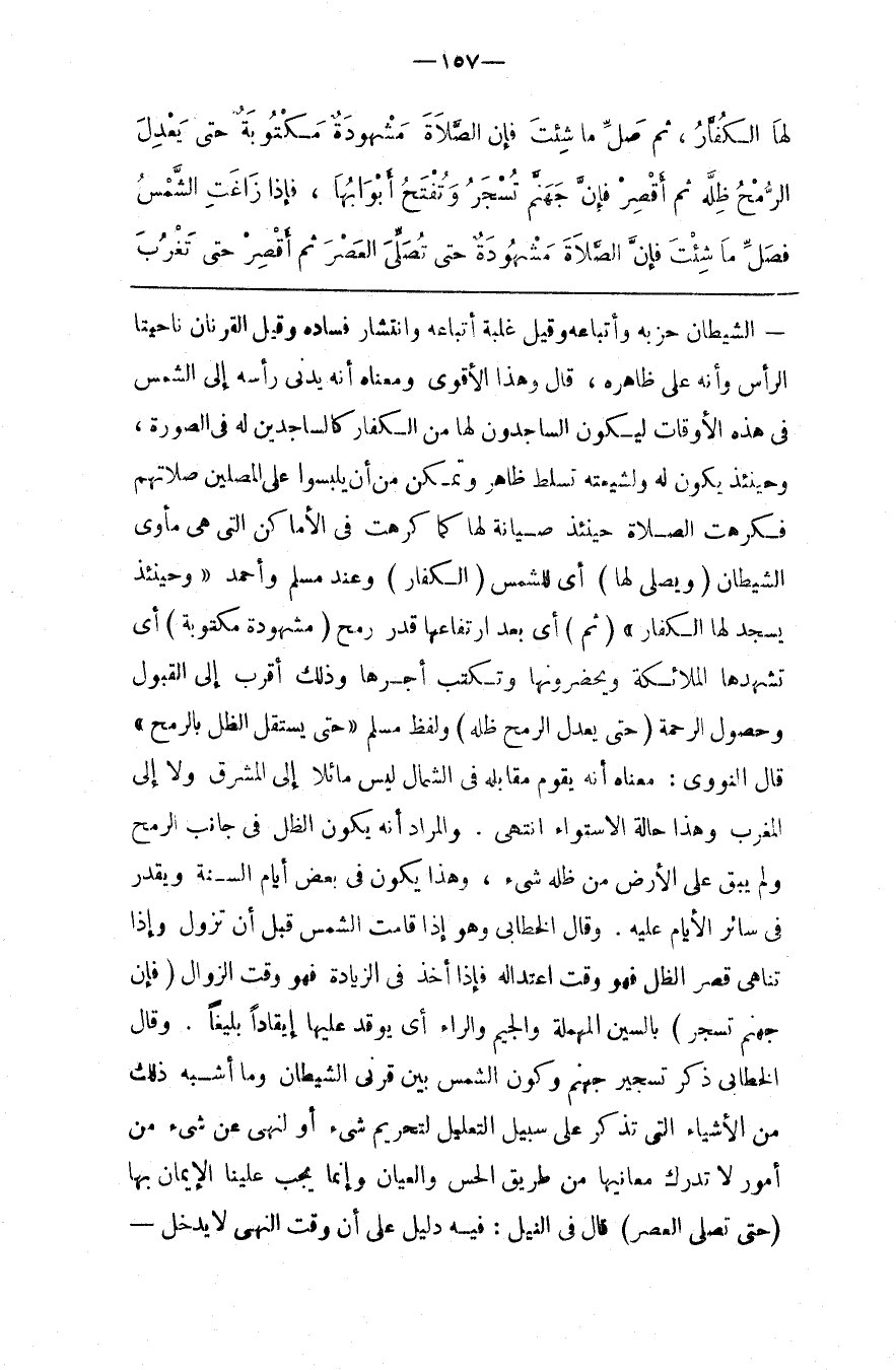 الشَّيْطَان حِزْبه وَأَتْبَاعه وَقِيلَ غَلَبَة أَتْبَاعه وَانْتِشَار فَسَاده وَقِيلَ الْقَرْنَانِ نَاحِيَتَا الرَّأْس وَأَنَّهُ عَلَى ظَاهِره ، قَالَ وَهَذَا الْأَقْوَى وَمَعْنَاهُ أَنَّهُ يُدْنِي رَأْسه إِلَى الشَّمْس فِي هَذِهِ الْأَوْقَات لِيَكُونَ السَّاجِدُونَ لَهَا مِنْ الْكُفَّار كَالسَّاجِدِينَ لَهُ فِي الصُّورَة ، وَحِينَئِذٍ يَكُون لَهُ وَلِشِيعَتِهِ تَسَلُّط ظَاهِر وَتَمَكُّن مِنْ أَنْ يُلْبِسُوا عَلَى الْمُصَلِّينَ صَلَاتهمْ فَكُرِهَتْ الصَّلَاة حِينَئِذٍ صِيَانَة لَهَا كَمَا كُرِهَتْ فِي الْأَمَاكِن الَّتِي هِيَ مَأْوَى الشَّيْطَان