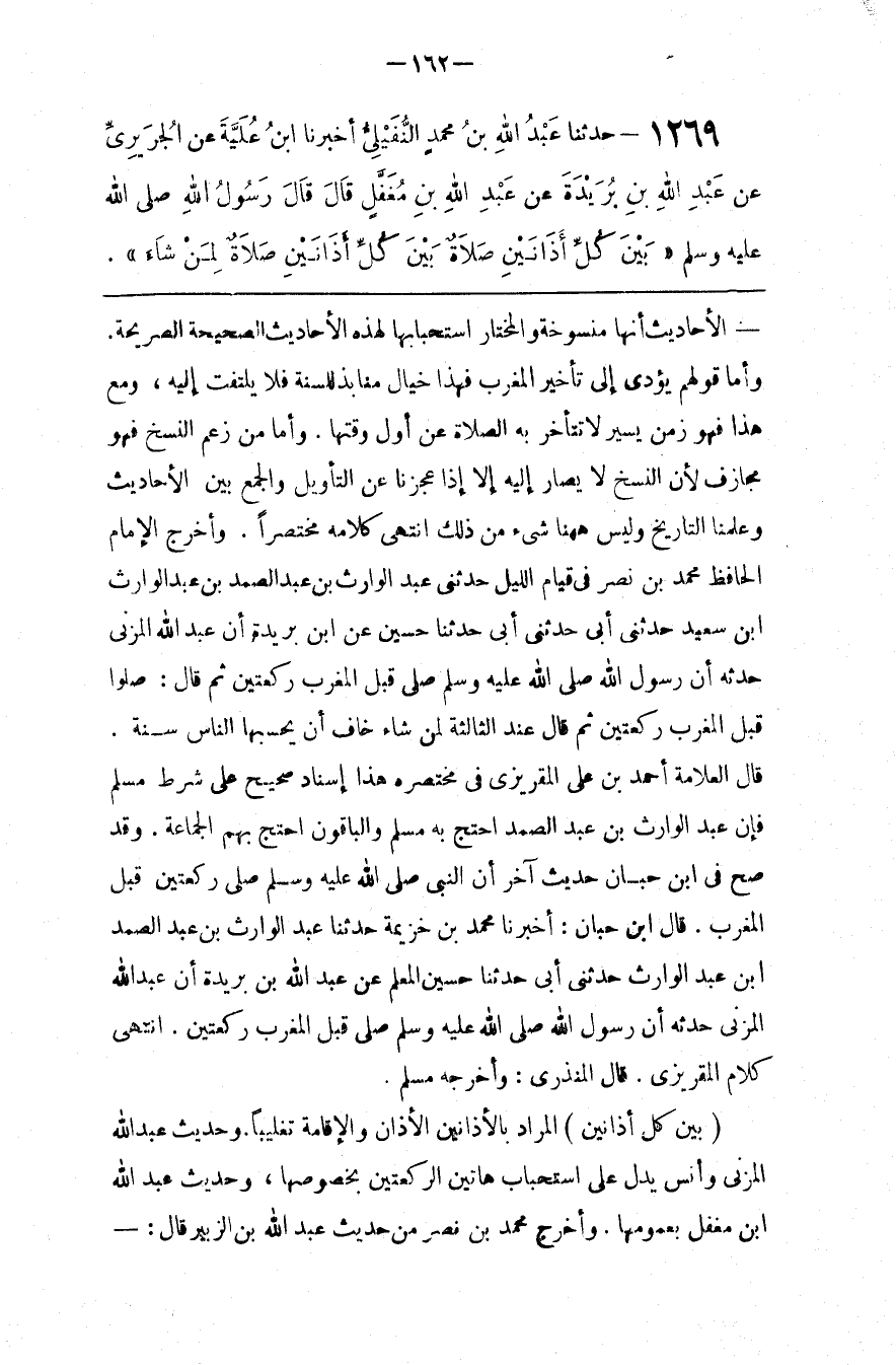 الْأَحَادِيث أَنَّهَا مَنْسُوخَة وَالْمُخْتَار اِسْتِحْبَابهَا لِهَذِهِ الْأَحَادِيث الصَّحِيحَة الصَّرِيحَة . وَأَمَّا قَوْلهمْ يُؤَدِّي إِلَى تَأْخِير الْمَغْرِب فَهَذَا خَيَال مُنَابِذ لِلسُّنَّةِ فَلَا يُلْتَفَت إِلَيْهِ ، وَمَعَ هَذَا فَهُوَ زَمَن يَسِير لَا تَتَأَخَّر بِهِ الصَّلَاة عَنْ أَوَّل وَقْتهَا . وَأَمَّا مَنْ زَعَمَ النَّسْخ فَهُوَ مُجَازِف لِأَنَّ النَّسْخ لَا يُصَار إِلَيْهِ إِلَّا إِذَا عَجَزْنَا عَنْ التَّأْوِيل وَالْجَمْع بَيْن الْأَحَادِيث وَعِلْمنَا التَّارِيخ وَلَيْسَ هَاهُنَا شَيْء مِنْ ذَلِكَ اِنْتَهَى كَلَامه مُخْتَصَرًا . وَأَخْرَجَ الْإِمَام الْحَافِظ مُحَمَّد بْن نَصْر فِي قِيَام اللَّيْل حَدَّثَنِي عَبْد الْوَارِث بْن عَبْد الصَّمَد بْن عَبْد الْوَارِث بْن سَعِيد حَدَّثَنِي أَبِي حَدَّثَنَا حُسَيْن عَنْ اِبْن بُرَيْدَةَ أَنَّ عَبْد اللَّه الْمُزَنِيّ حَدَّثَهُ أَنَّ رَسُول اللَّه صَلَّى اللَّه عَلَيْهِ وَسَلَّمَ صَلَّى قَبْل الْمَغْرِب رَكْعَتَيْنِ ثُمَّ قَالَ : صَلُّوا قَبْل الْمَغْرِب رَكْعَتَيْنِ ثُمَّ قَالَ عِنْد الثَّالِثَة لِمَنْ شَاءَ خَافَ أَنْ يَحْسِبهَا النَّاس سُنَّة . قَالَ الْعَلَّامَة أَحْمَد بْن عَلِيّ الْمَقْرِيزِيّ فِي مُخْتَصَره هَذَا إِسْنَاد صَحِيح عَلَى شَرْط مُسْلِم فَإِنَّ عَبْد الْوَارِث بْن عَبْد الصَّمَد اِحْتَجَّ بِهِ مُسْلِم وَالْبَاقُونَ اِحْتَجَّ بِهِمْ الْجَمَاعَة . وَقَدْ صَحَّ فِي اِبْن حِبَّان حَدِيث آخَر أَنَّ النَّبِيّ صَلَّى اللَّه عَلَيْهِ وَسَلَّمَ صَلَّى رَكْعَتَيْنِ قَبْل الْمَغْرِب . قَالَ اِبْن حِبَّان : أَخْبَرَنَا مُحَمَّد بْن خُزَيْمَةَ حَدَّثَنَا عَبْد الْوَارِث بْن عَبْد الصَّمَد بْن عَبْد الْوَارِث حَدَّثَنِي أَبِي حَدَّثَنَا حُسَيْن الْمُعَلَّم عَنْ عَبْد اللَّه بْن بُرَيْدَةَ أَنَّ عَبْد اللَّه الْمُزَنِيّ حَدَّثَهُ أَنَّ رَسُول اللَّه صَلَّى اللَّه عَلَيْهِ وَسَلَّمَ صَلَّى قَبْل الْمَغْرِب رَكْعَتَيْنِ . اِنْتَهَى كَلَام الْمَقْرِيزِيّ